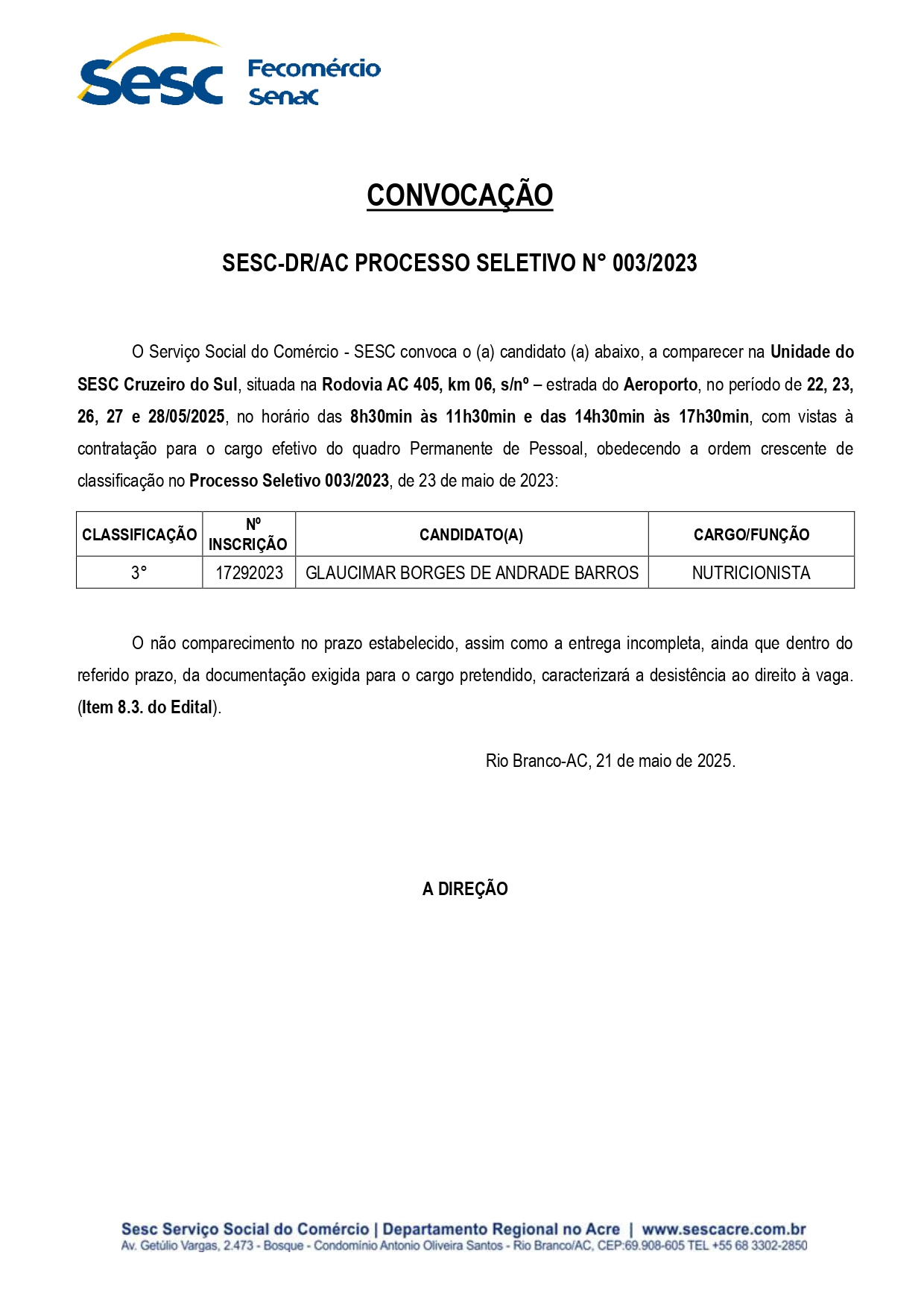 Convocação Processo Seletivo nº 003/2023 Sesc-DR/AC