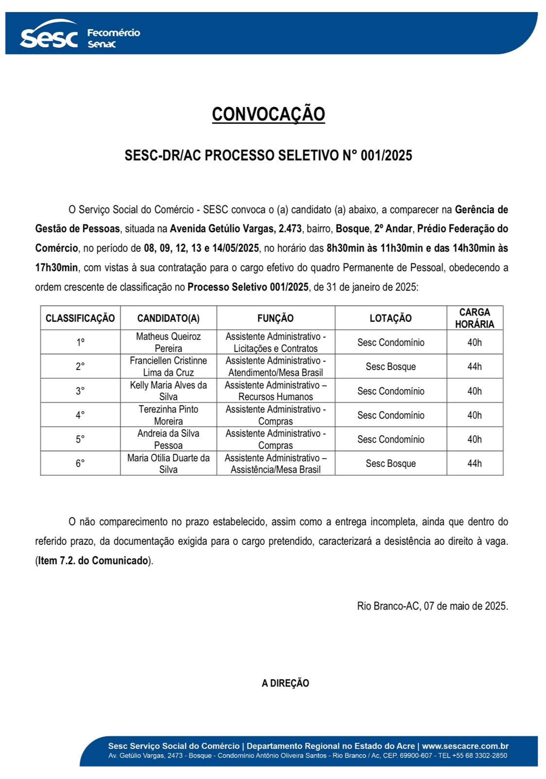 Convocação Sesc-DR/AC Processo Seletivo N° 001/2025