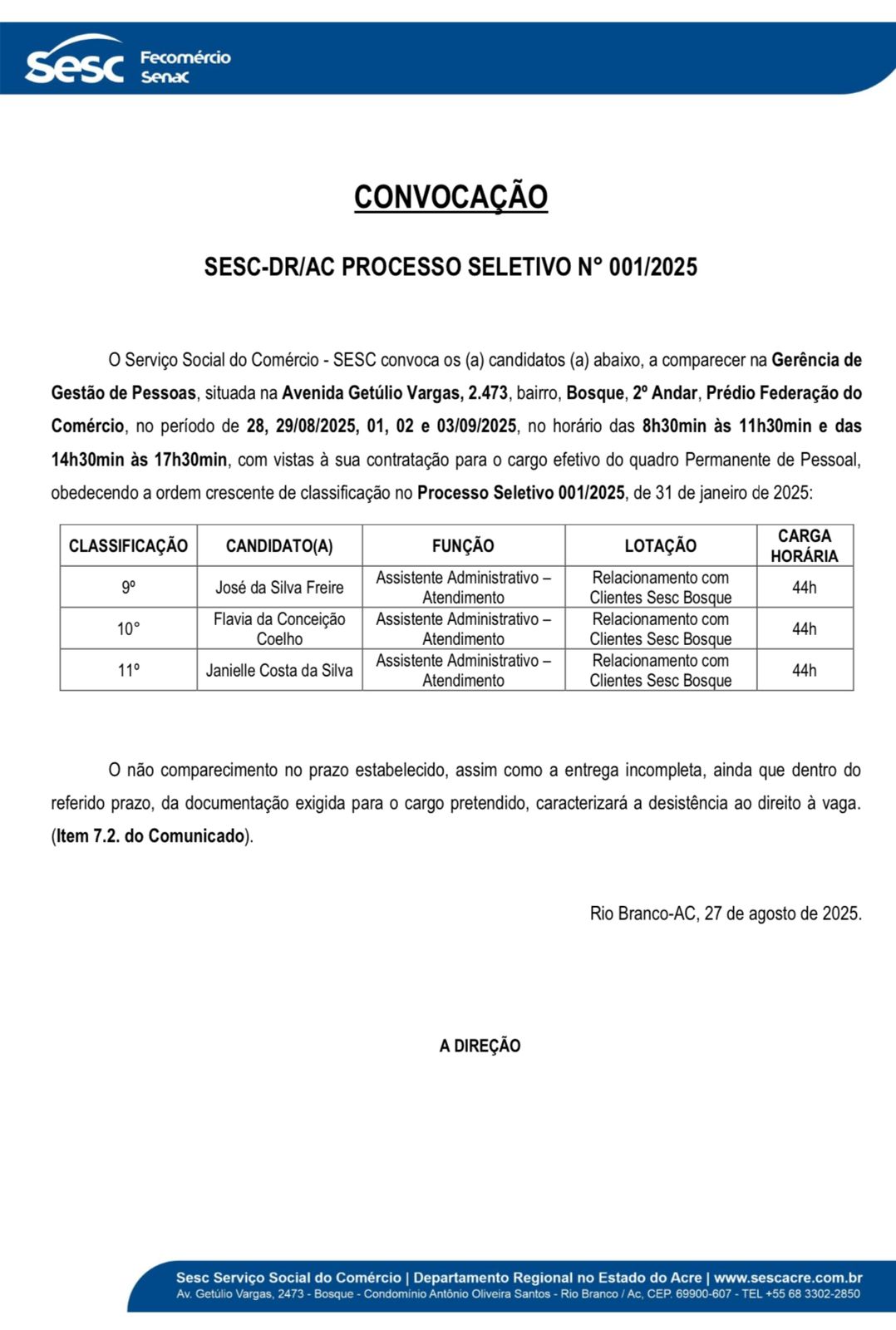 Convocação Sesc-DR/AC Processo Seletivo n° 001/2025
