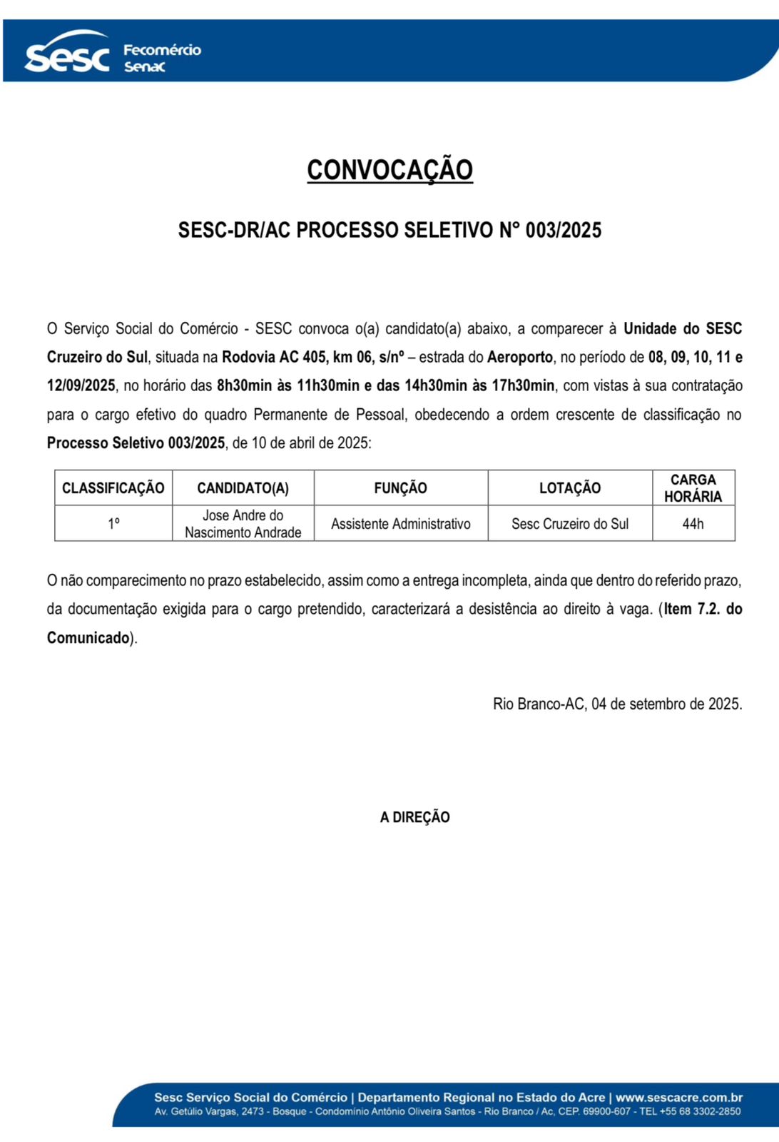 Convocação Sesc-DR/AC Processo Seletivo N° 003/2025