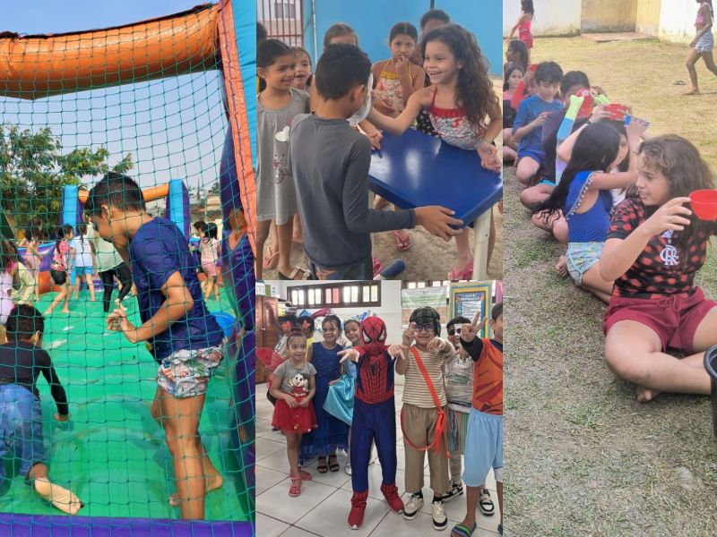 Na Escola Álvaro Vieira da Costa, o pátio virou palco de risadas e muita criatividade. A direção da escola decidiu ir além e incluiu oficinas de arte, atividades temáticas e brinquedos infláveis. Com o apoio do Sesc, a proposta foi garantir que cada criança tivesse uma experiência única.