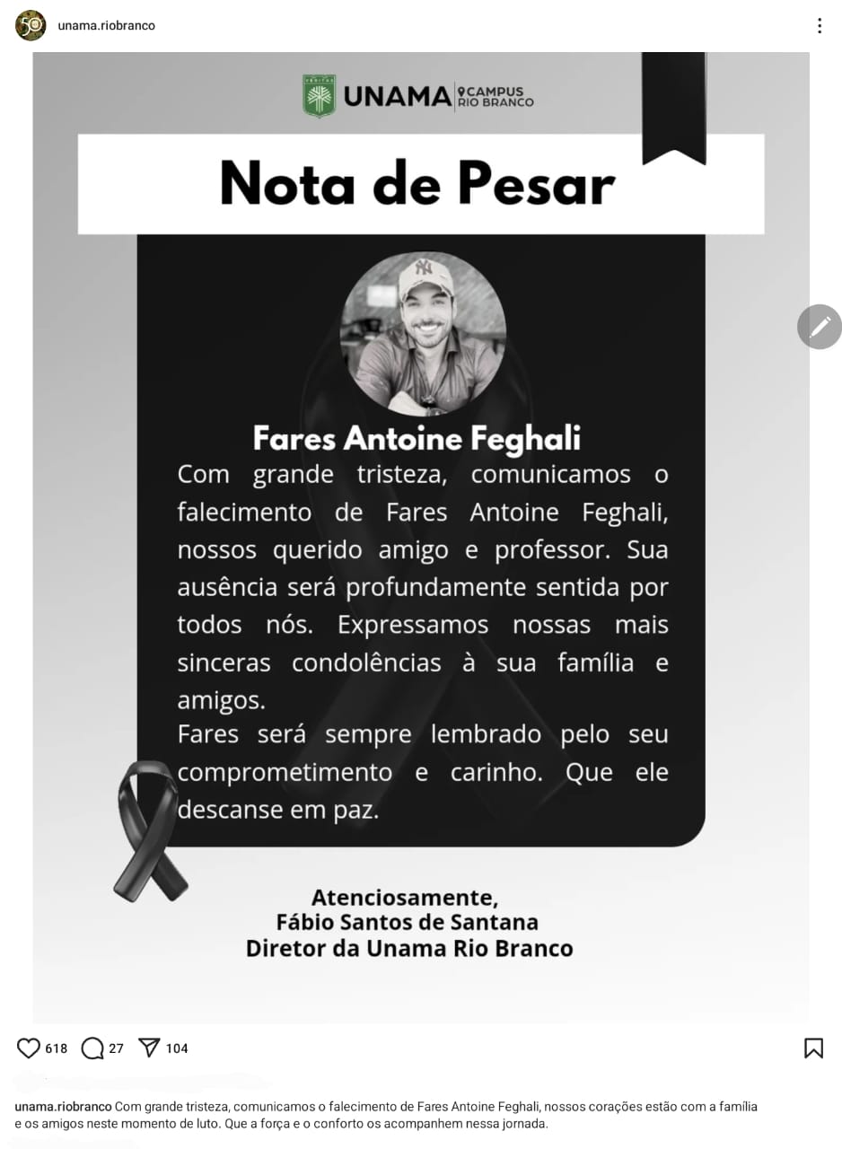 A Universidade da Amazônia (Unama), onde Fares atuava como professor, também emitiu uma nota, na qual expressou profunda tristeza pela perda de um colega querido e professor comprometido. “A ausência será profundamente sentida por todos nós”, diz o comunicado.