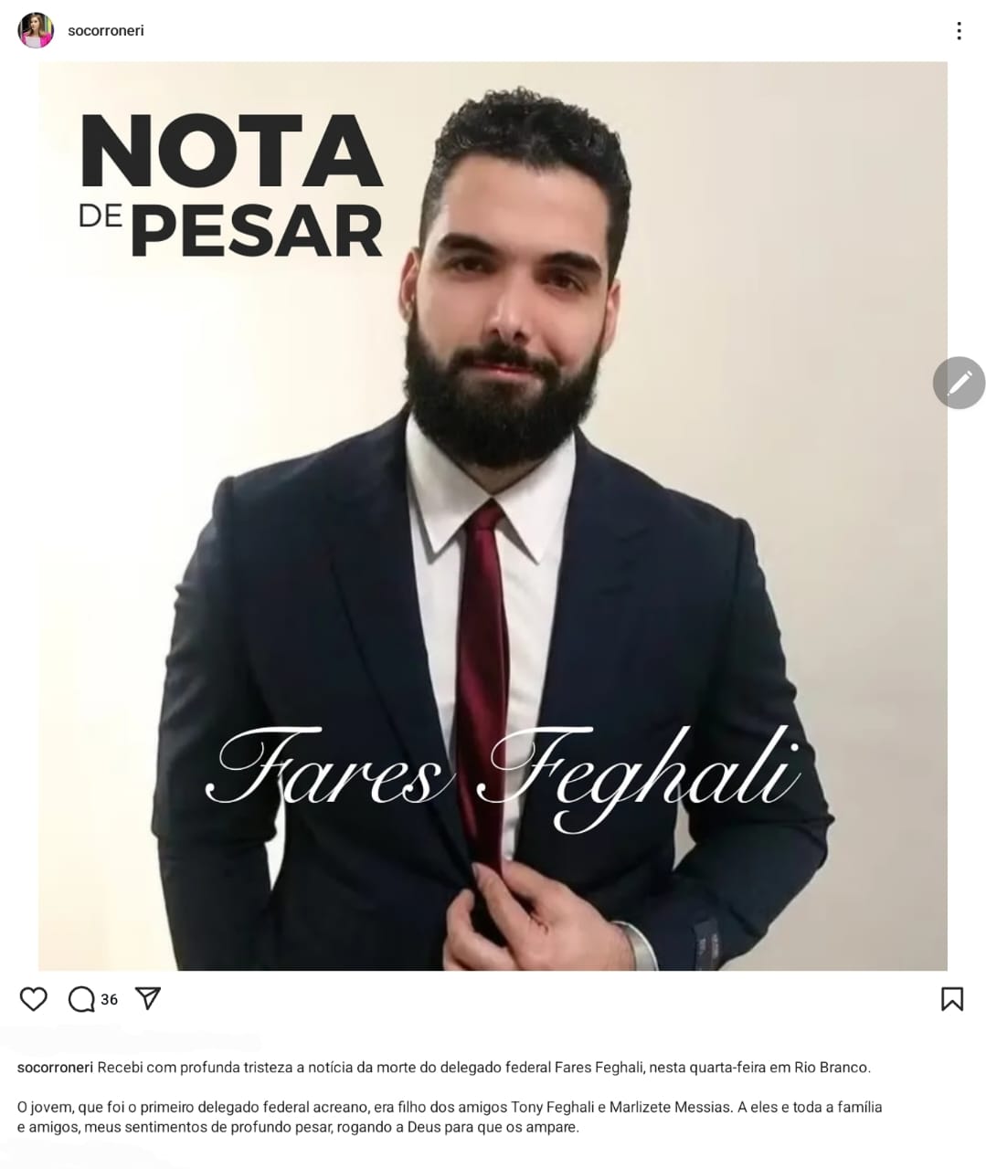 A deputada federal Socorro Neri lamentou a morte de Fares, que foi o primeiro delegado federal acreano, e enviou as condolências aos familiares, especialmente aos pais Tony Feghali e Marlizete Messias.