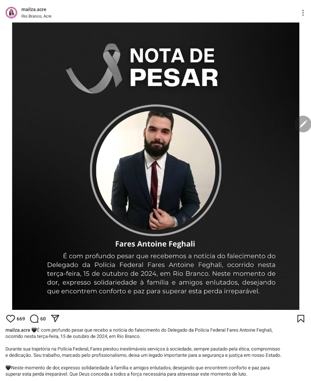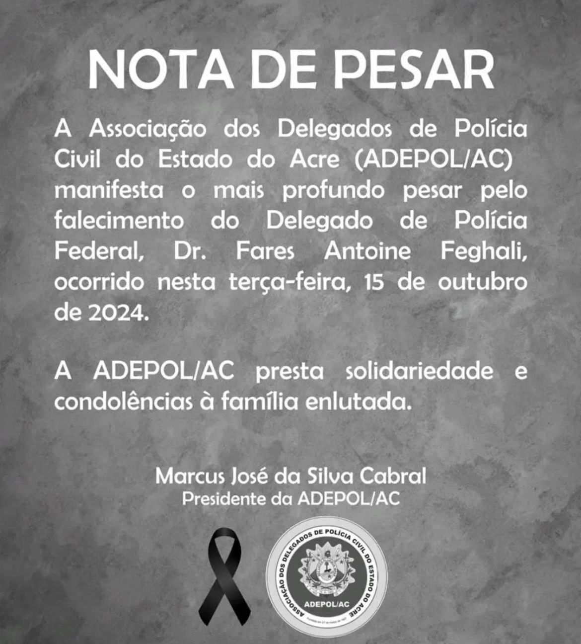 Fares foi encontrado morto na tarde de terça-feira, em uma sala do Centro Empresarial, localizado no Centro da capital acreana. Autoridades locais, instituições e órgãos emitiram notas de pesar, lamentando a perda do delegado, que atuava na Polícia Federal desde 2016 e era conhecido pela dedicação no combate ao crime organizado.