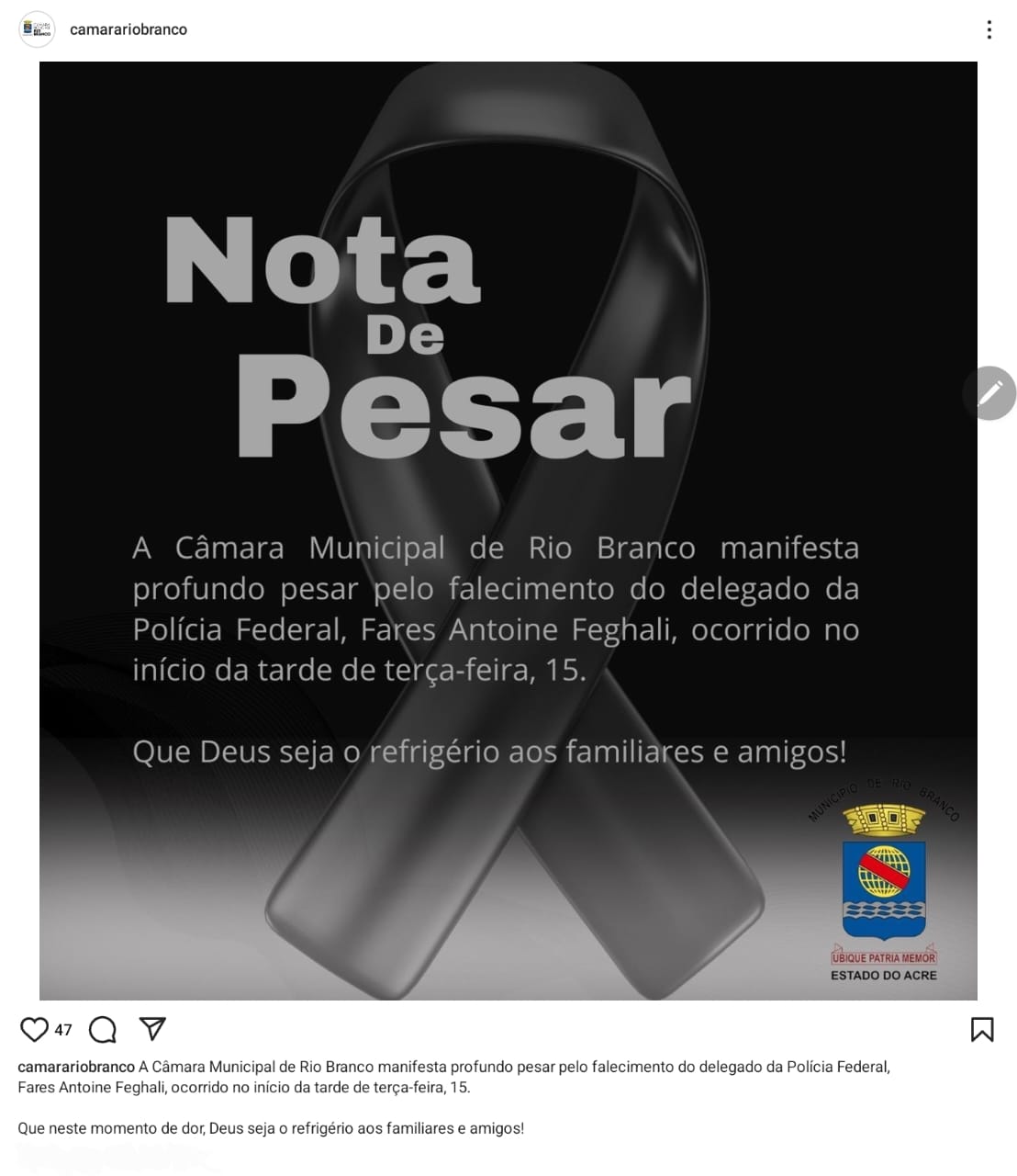 A Câmara Municipal de Rio Branco e a vice-governadora do Acre, Mailza Assis, completaram a série de manifestações de pesar, todas destacando o legado deixado pelo delegado e oferecendo palavras de conforto aos familiares.
