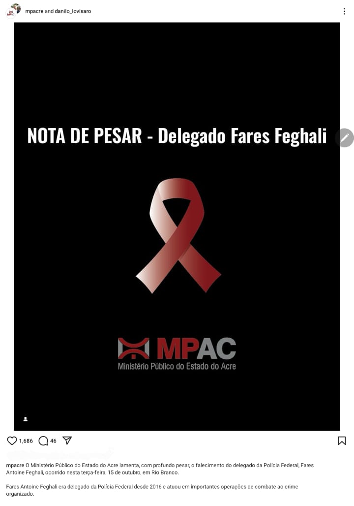 O Ministério Público do Estado do Acre (MPAC) também se pronunciou, destacando a atuação de Fares em importantes operações contra o crime organizado. Em nome dos membros e servidores, o MPAC se solidarizou com a família e amigos, rogando conforto neste momento de dor.