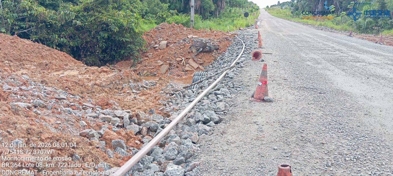 O trecho mais crítico está localizado no km 722 da rodovia, em Cruzeiro do Sul, e foi afetado pela elevação do nível do Igarapé Santa Luzia, que provocou a saturação do subleito, processos erosivos profundos e a ruptura do pavimento.