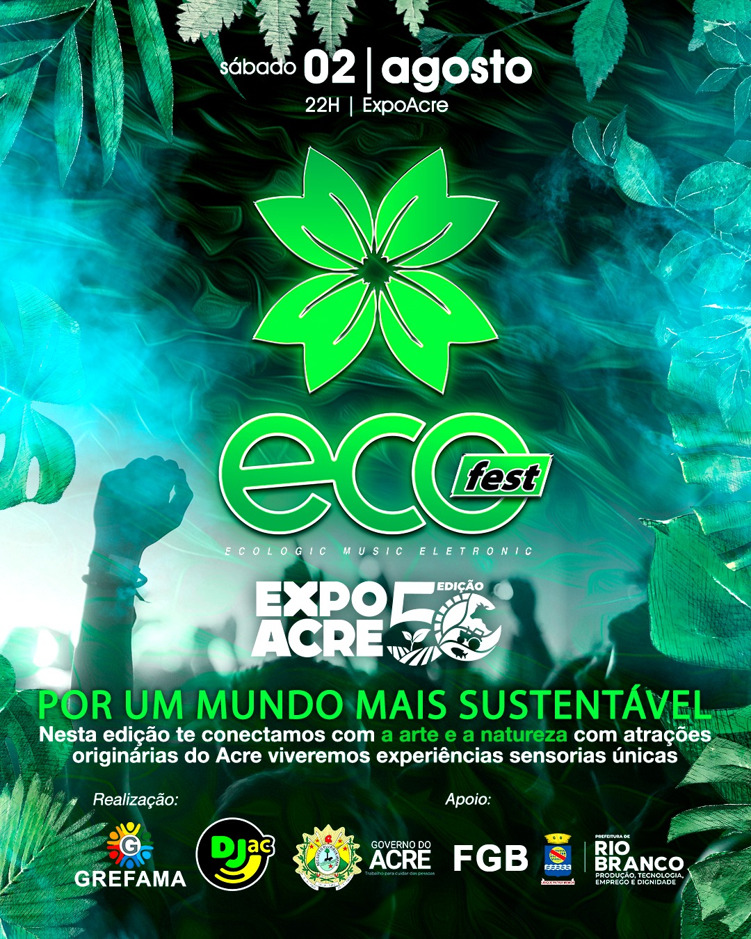 Um realização do Grêmio Recreativo Frutos do Amanhã – GREFAMA com apoio do Governo do Estado do Acre, da Prefeitura Municipal de Rio Branco e do DJAC, a ECOFEST 2025 promete uma imersão no universo da música eletrônica com responsabilidade ambiental — um evento que vai marcar o calendário cultural do estado.