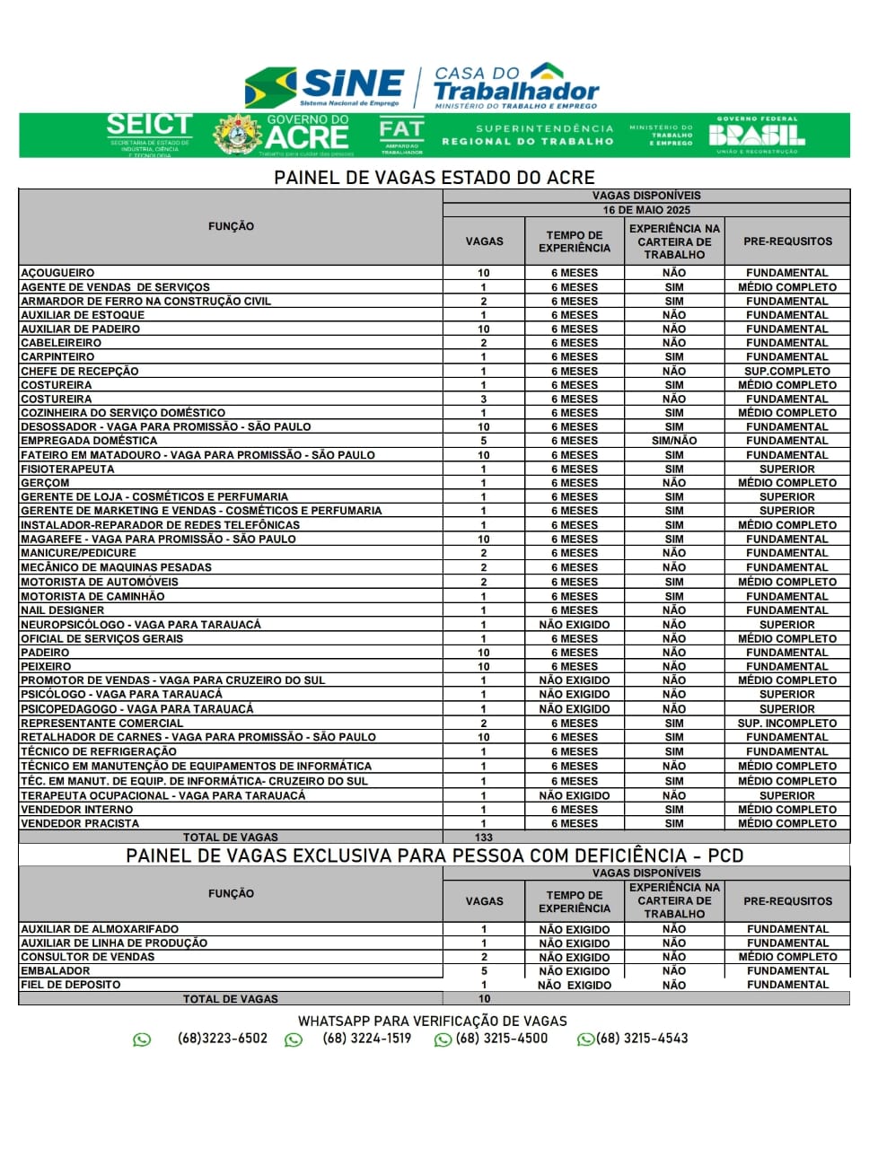 O Sistema Nacional de Emprego do Acre (Sine-AC) oferece 133 vagas de emprego para a população de Rio Branco nesta sexta-feira (16). Destas vagas, 10 são destinadas exclusivamente às pessoas com deficiência.