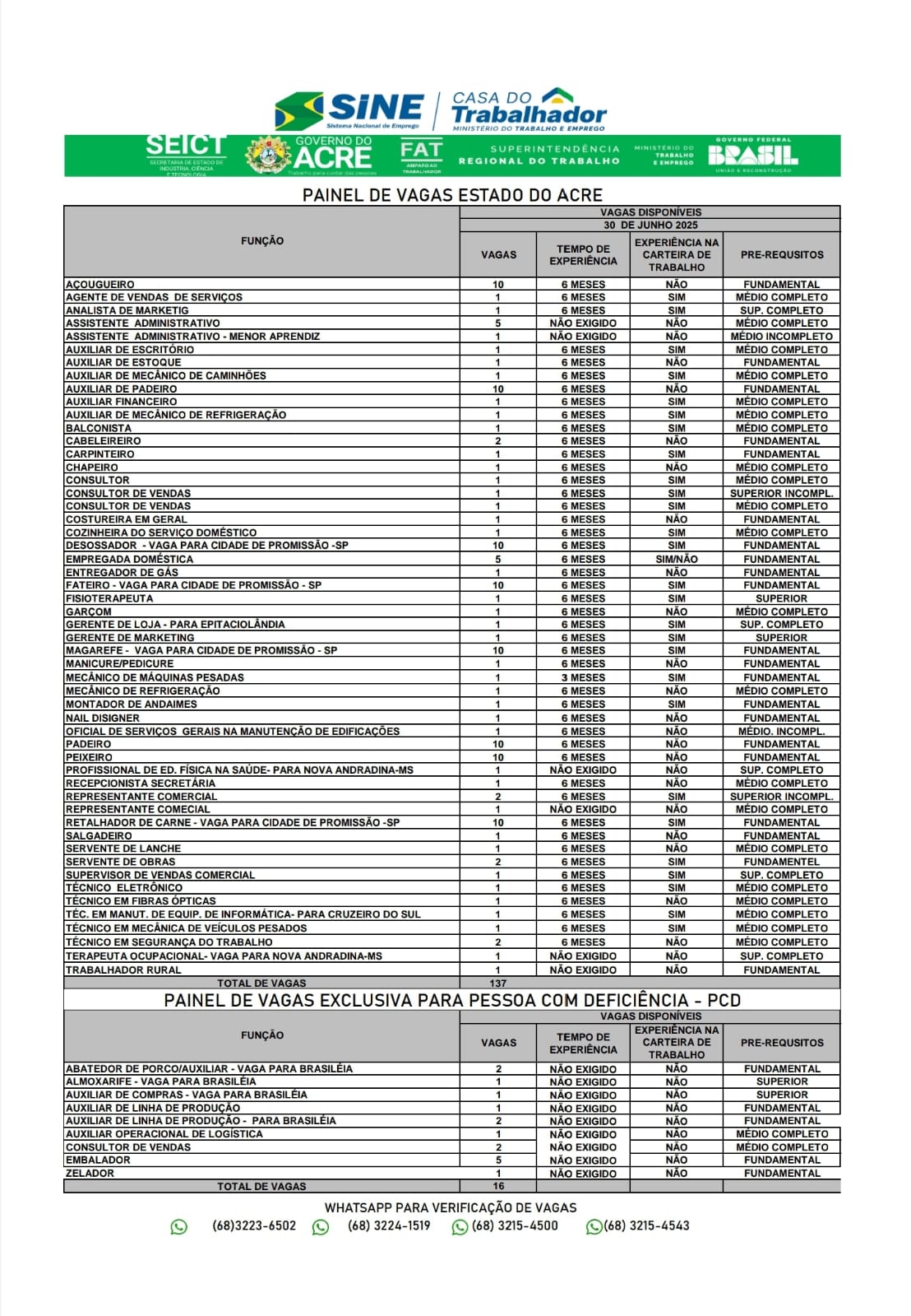 O Sistema Nacional de Emprego do Acre (Sine-AC) oferece 153 vagas de emprego para a população de Rio Branco nesta segunda-feira (30). Destas vagas, 16 são destinadas exclusivamente às pessoas com deficiência.