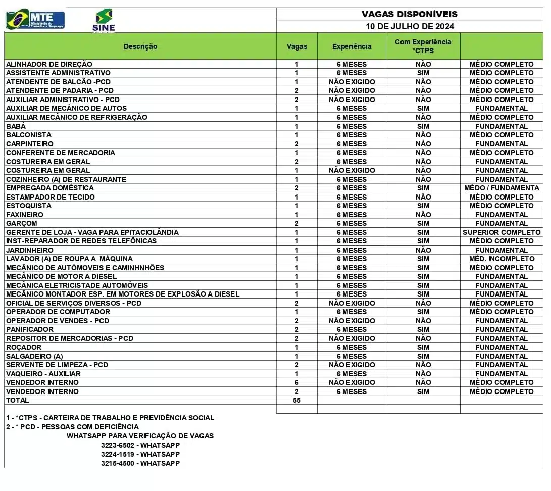 As oportunidades abrangem desde o ensino fundamental até o médio completo e são destinadas a pessoas com ou sem experiência prévia no mercado de trabalho. As inscrições podem ser realizadas por telefone, via WhatsApp, ou presencialmente.