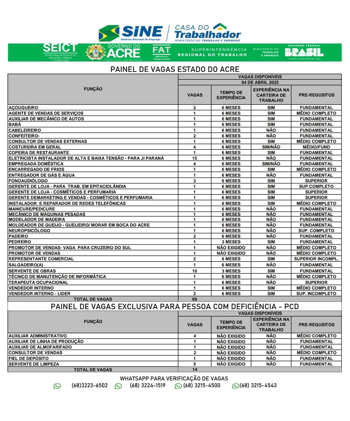 O Sistema Nacional de Emprego do Acre (Sine-AC) oferece 83 vagas de emprego para a população de Rio Branco nesta segunda-feira (31). Destas vagas, 14 são destinadas exclusivamente às pessoas com deficiência.
