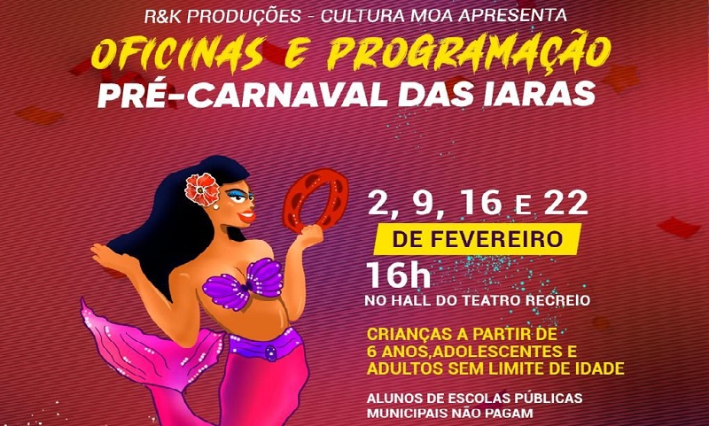 Além disso, estão sendo ofertadas mais três oficinas, construção de instrumentos com descartáveis, ministrada musicista e poetisa Neiva Nara, oficina de percussão, com o percussionista Deivid de Menezes, e confecção de máscaras de carnaval, pelo artista visual Claudeney Alves.