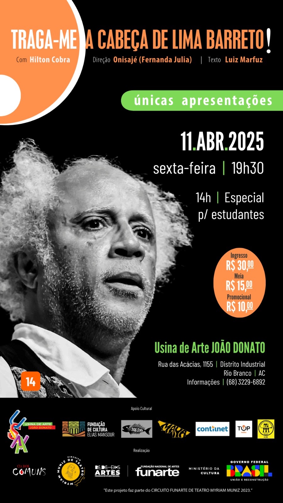 Pela primeira vez no Acre, o premiado espetáculo “Traga-me a Cabeça de Lima Barreto!”, estrelado pelo ator Hilton Cobra, chega a Rio Branco nesta sexta-feira (11), para duas sessões na Usina de Arte João Donato: às 14h30 para estudantes e às 19h30 para o público geral. Com ingressos que variam de R$ 10 a R$ 30, a apresentação faz parte do Circuito Funarte de Teatro Myriam Muniz 2023, com apoio do Ministério da Cultura.