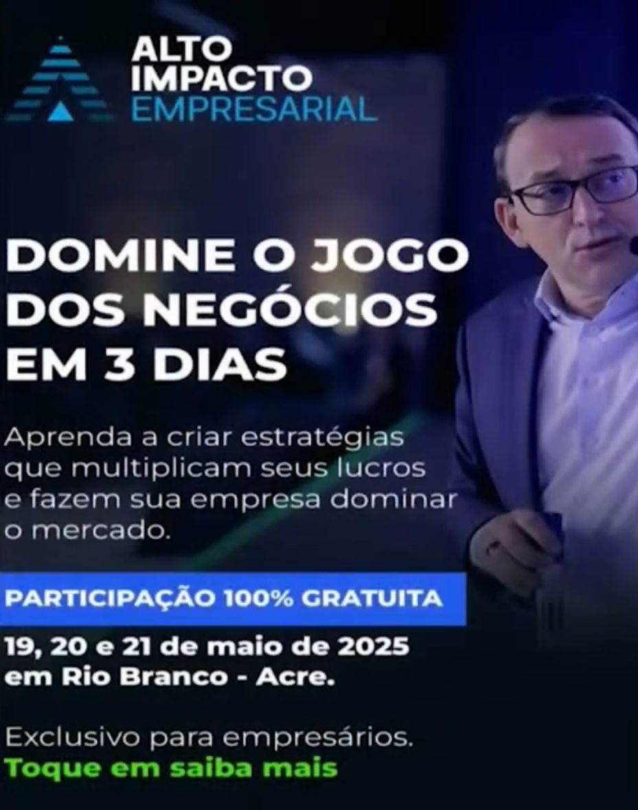 Empreendedores de Rio Branco terão a chance de mergulhar em três dias de aprendizado estratégico com grandes nomes do empreendedorismo brasileiro. A capital vai receber, de 19 a 21 de maio, a imersão 100% gratuita Alto Impacto Empresarial, que será conduzida pelo especialista José Roberto Marques, referência nacional em desenvolvimento humano e gestão de negócios.