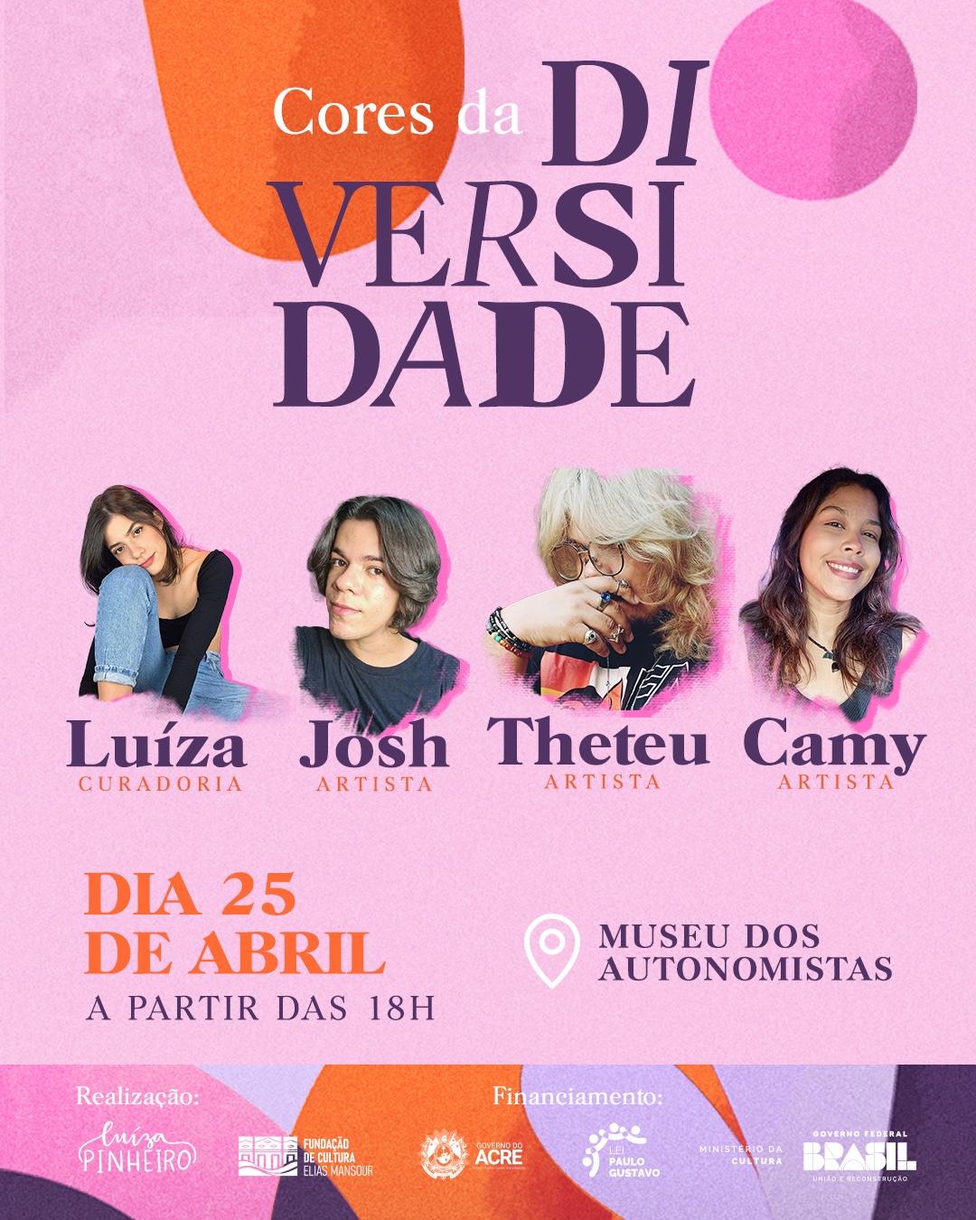 A exposição “Cores da Diversidade” proporciona uma oportunidade única de aprender sobre diferentes estilos artísticos e seus contextos históricos e culturais, além de estimular o envolvimento da comunidade com a arte e a cultura como instrumentos de transformação social. O evento tem financiamento da Lei Paulo Gustavo (LPG), por meio do Governo Federal e do Governo do Estado do Acre, via Fundação de Cultura Elias Mansour (FEM).