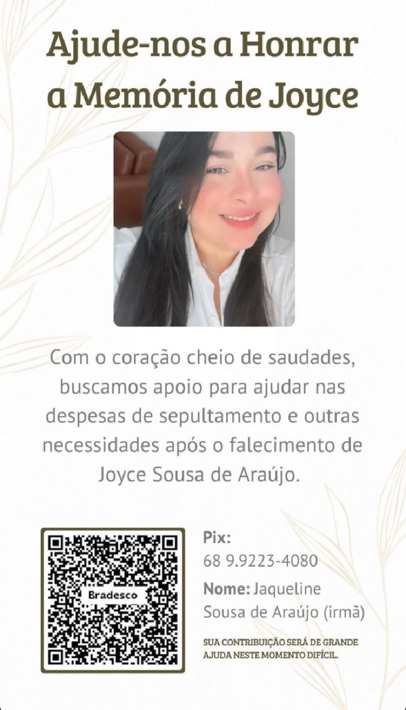 “Com o coração cheio de saudades, buscamos apoio para ajudar nas despesas de sepultamento e outras necessidades após o falecimento de Joyce Sousa de Araújo”, diz a publicação de irmã, que busca sensibilizar a comunidade para ajudar a família a lidar com os custos inesperados.