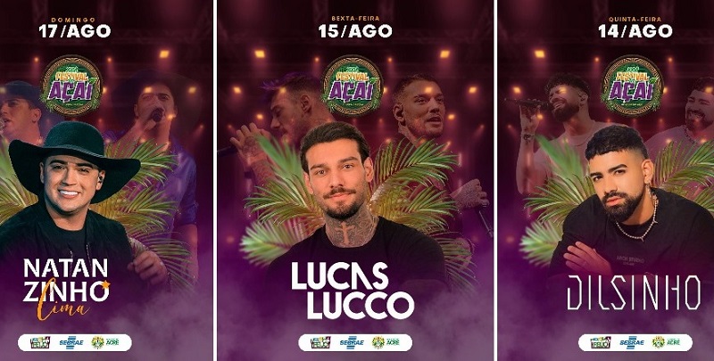 A Prefeitura de Feijó anunciou, neste domingo (11), por meio das redes sociais, as primeiras atrações confirmadas para o Festival do Açaí 2025. Os cantores Lucas Lucco, Natanzinho e Dilsinho estão entre os nomes de destaque da programação artística do evento, que deve movimentar a cidade no mês de agosto.