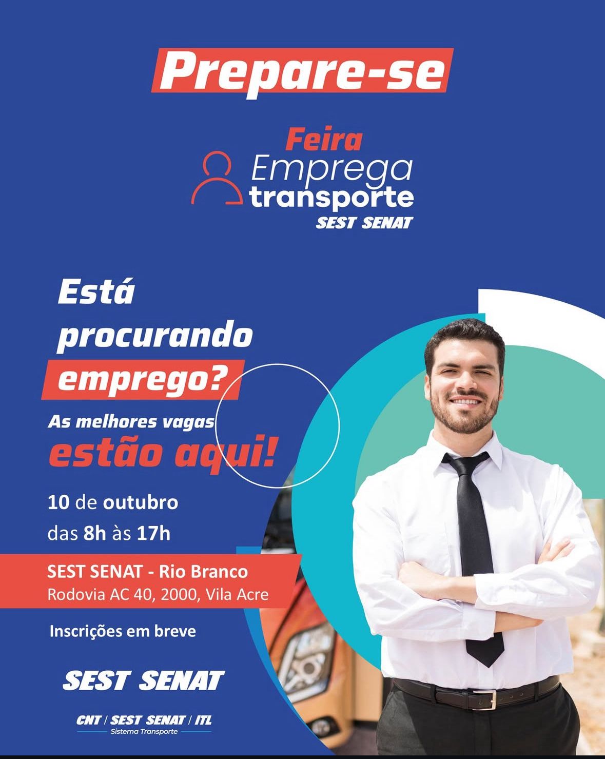 A capital acreana recebe no dia 10 de outubro, das 8h às 17h, a Feira Emprega Transporte, uma iniciativa do Sest Senat em parceria com Raquel Albuquerque, influenciadora conhecida como “A Menina das Vagas”, que atua durante todo o ano na divulgação de oportunidades de trabalho pelas redes sociais.