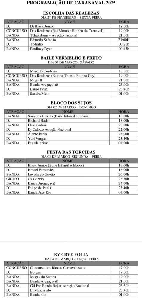 Já na terça-feira, dia 4 de março, o Carnaval da Família chega no último dia com o tradicional Bye Bye Folia. A programação começa às 17h, com o Concurso dos Blocos Carnavalescos, que promete reunir diversos blocos famosos, como Unidos do Fuxico e 6 é D+, entre outros. Os três primeiros colocados serão premiados.