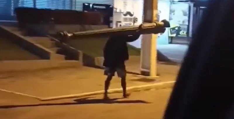 O homem carregava o objeto nas costas, algo que chamou atenção das pessoas, que começaram a gravar o caso.