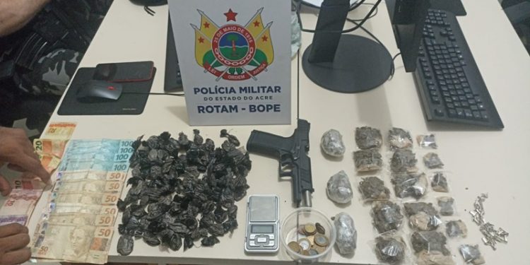 Equipes de Rondas Ostensivas Tático Móvel (Rotam/Bope) da Polícia Militar do Acre (PMAC) desarticularam na noite desta sexta-feira, 17, um ponto de venda de drogas em Rio Branco e apreenderam uma arma de fogo adaptada. O fato ocorreu no Bairro Habitasa, onde um homem foi preso e uma adolescente apreendida.