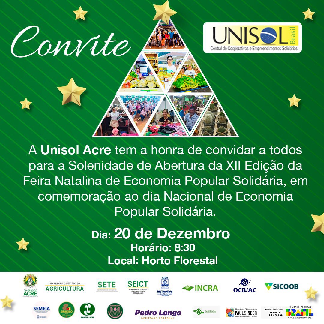 O evento é uma realização da Unisol Acre em parceria com a Prefeitura de Rio Branco, Governo do Estado do Acre, Organização das Cooperativas Brasileiras (OCB/AC), SICOOB, Ministério do Trabalho e Emprego (MTE), Ministério do Desenvolvimento Agrário (MDA), Secretaria Nacional de Economia Popular e Solidária (SENAES), Incra, Conab/Acre, Reaja, Sescoop, Gabinete do Deputado Estadual Pedro Longo, Central Única dos Trabalhadores (CUT), Instituto Federal do Acre (IFAC), EMATER, Secretaria de Estado de Turismo e Empreendedorismo (SETE), Secretaria de Estado de Indústria, Ciência e Tecnologia (SEICT), Secretaria Municipal de Meio Ambiente (SEMEIA) e Programa de Formação Paul Singer.