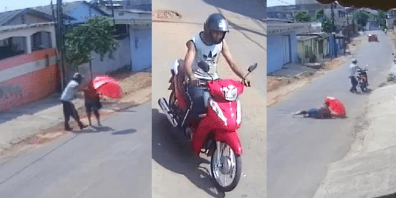 Nas imagens fornecidas por câmera de segurança, é possível ver a senhora caminhando tranquilamente pela rua quando um homem, em uma moto modelo Biz, passa e para logo em seguida. Ele desce rapidamente do veículo e se aproxima da vítima, que, sem chance de defesa, é atacada. O criminoso rouba um objeto pessoal da senhora, que cai ao chão devido à brutalidade do assalto.