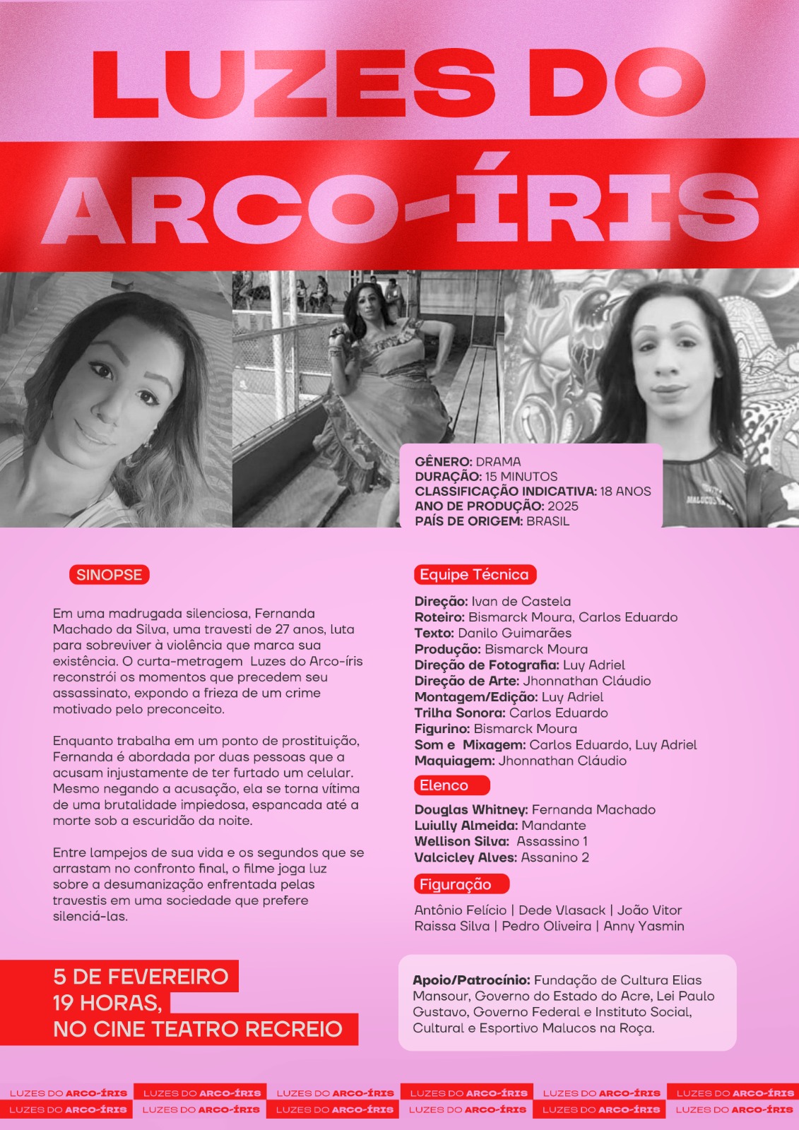 O curta-metragem “Luzes do Arco-Íris”, de Bismark Moura e Carlos Eduardo, dirigido por Ivan de Castela, terá sua estreia no dia 5 de fevereiro, às 19h, no Cine Teatro Recreio, em Rio Branco, Acre. O drama de 15 minutos reconstrói, de forma impactante, os últimos momentos de Fernanda Machado da Silva, uma travesti de 27 anos, vítima de um crime brutal motivado pelo preconceito.