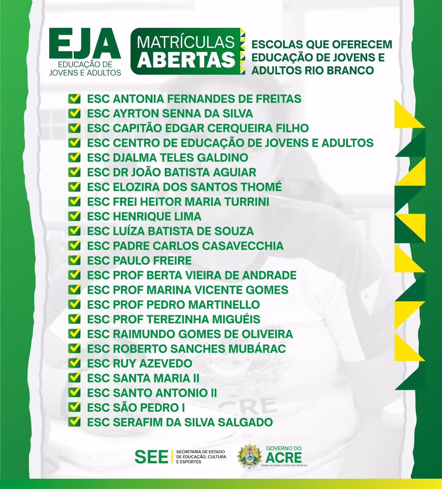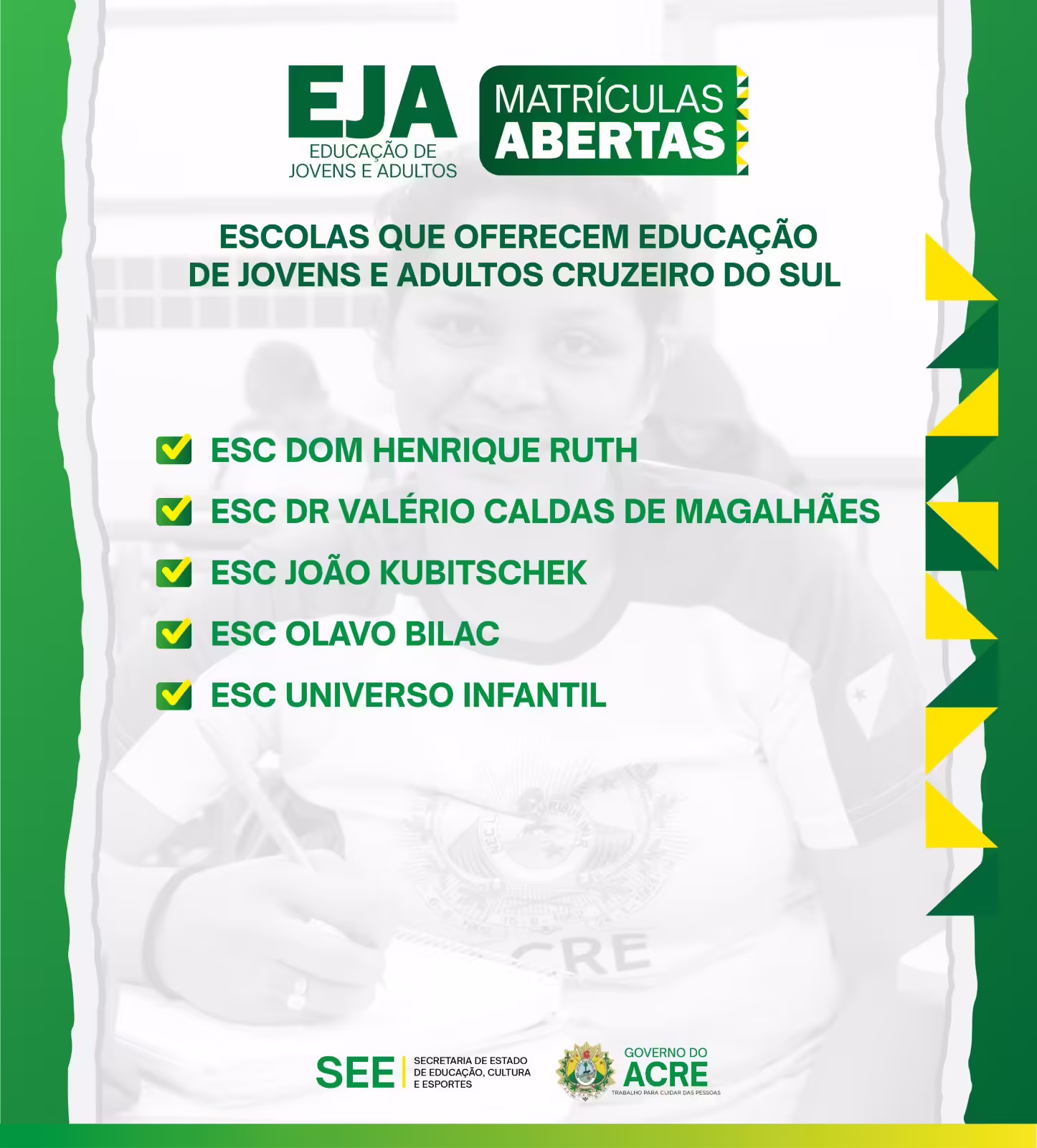 As matrículas para a Educação de Jovens e Adultos do Acre (EJA) se encerram nesta sexta-feira (26). Os candidatos devem procurar a escola mais próxima da rede estadual que ofereça a modalidade, portando documento de identificação, comprovante de residência e histórico escolar.