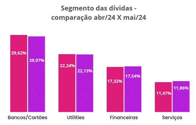 Os bancos e cartões continuam sendo as principais causas das dívidas, seguidos pelas contas básicas de água, luz e gás natural, embora ambos os segmentos tenham registrado quedas de 1,87 e 0,5 pontos percentuais, respectivamente. O segmento de serviços foi o que mais cresceu em maio, representando 11,86% das dívidas, ficando atrás apenas das financeiras.