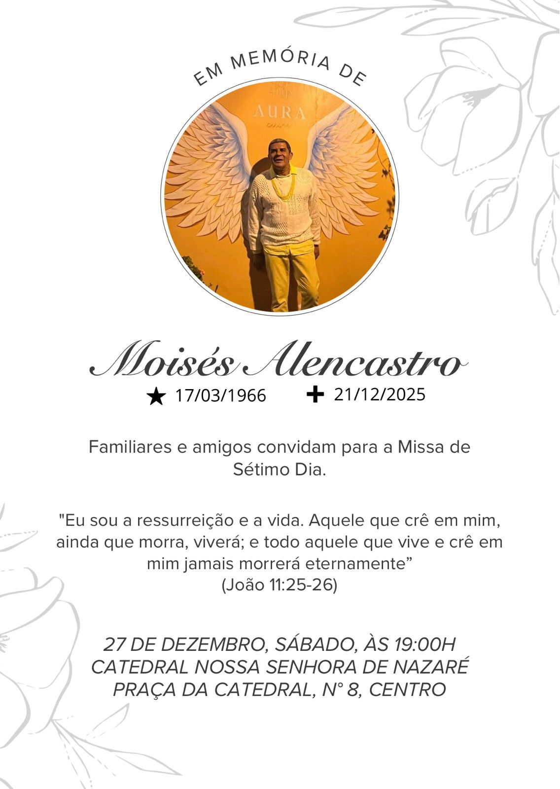 A missa de sétimo dia do colunista social Moisés Alencastro acontece às 19h, neste sábado (27), na Catedral Nossa Senhora de Nazaré, em Rio Branco. Reconhecido por sua atuação na cultura, no serviço público e na defesa dos direitos humanos, Moisés foi encontrado morto no próprio apartamento na noite do último sábado (22).