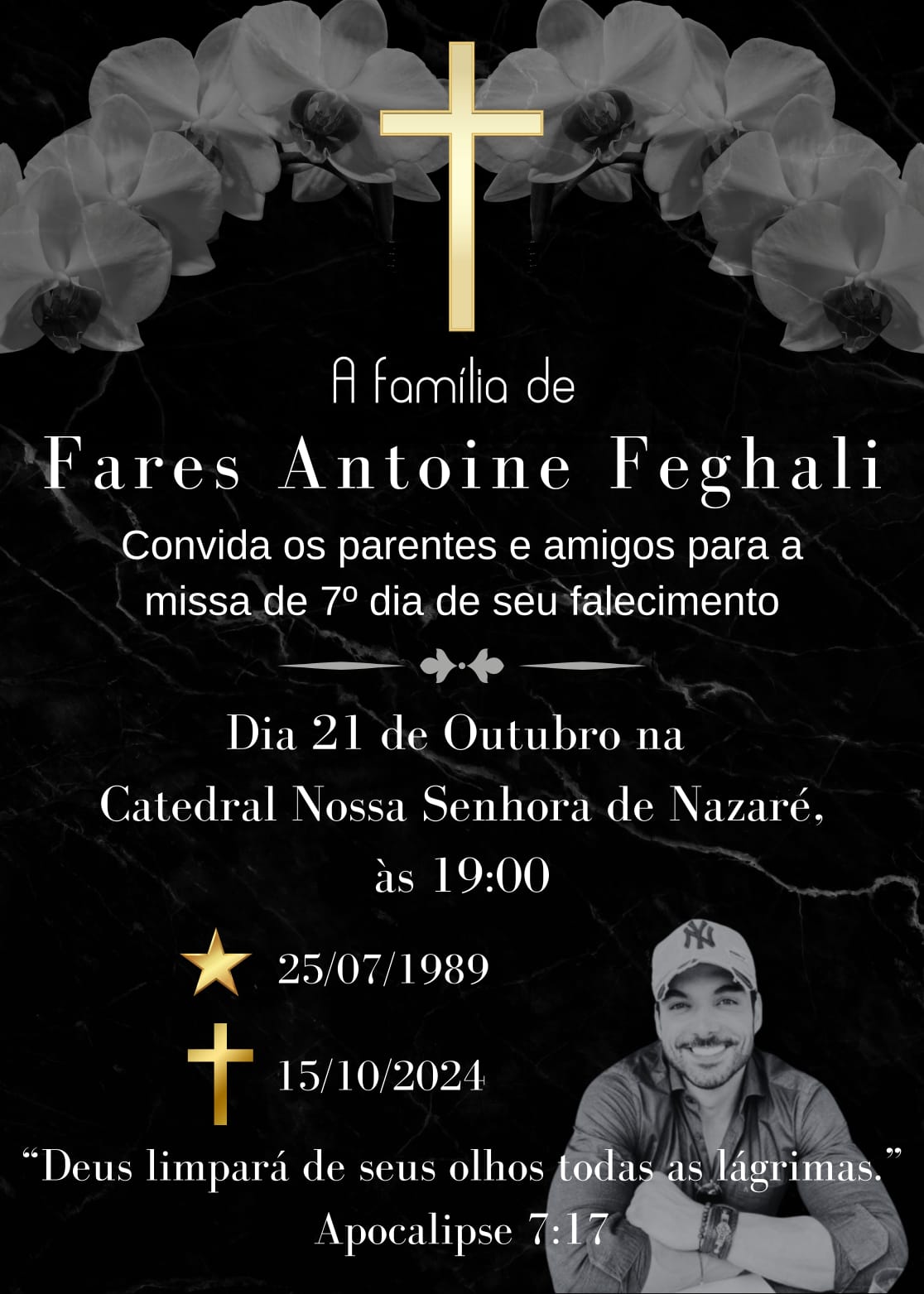 A família do delegado da Polícia Federal Fares Antoine Feghali, falecido no dia 15 de outubro de 2024, convida parentes e amigos para as missas de 7º dia em sua memória, que serão realizadas em três cidades do Acre.