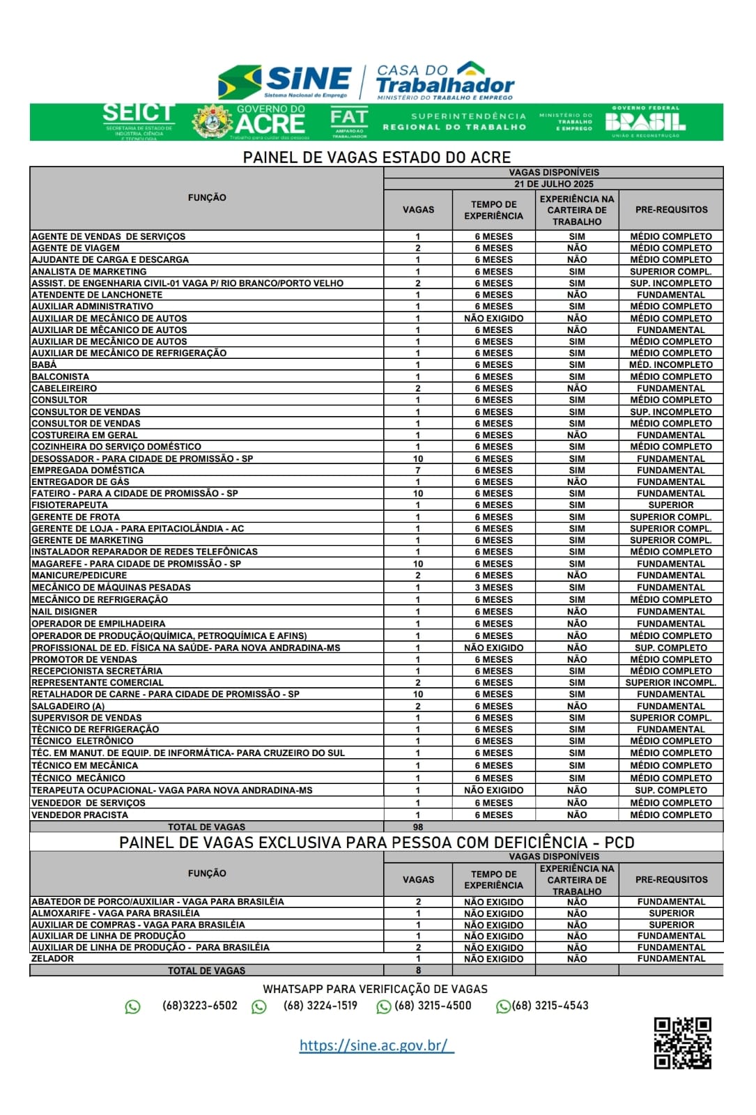 O Sistema Nacional de Emprego do Acre (Sine) oferece 106 vagas de emprego para a população de Rio Branco nesta segunda-feira (21). Destas vagas, 8 são destinadas exclusivamente à pessoas portadoras de deficiência.
