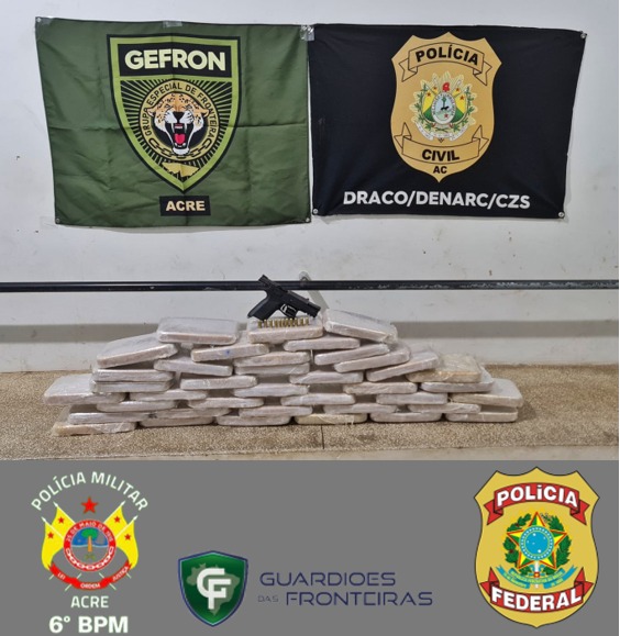 A ação integrada, que ocorreu na tarde de ontem, 24, contou com agentes da Polícia Civil, Polícia Militar, Polícia Federal e Gefron. Além da apreensão de 38,530 kg de oxidado de cocaína, também foi apreendida uma pistola 9mm com 11 munições.