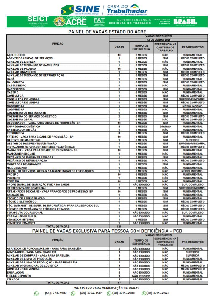 O Sistema Nacional de Emprego do Acre (Sine-AC) oferece 148 vagas de emprego para a população de Rio Branco nesta quinta-feira (12). Destas vagas, 17 são destinadas exclusivamente às pessoas com deficiência.