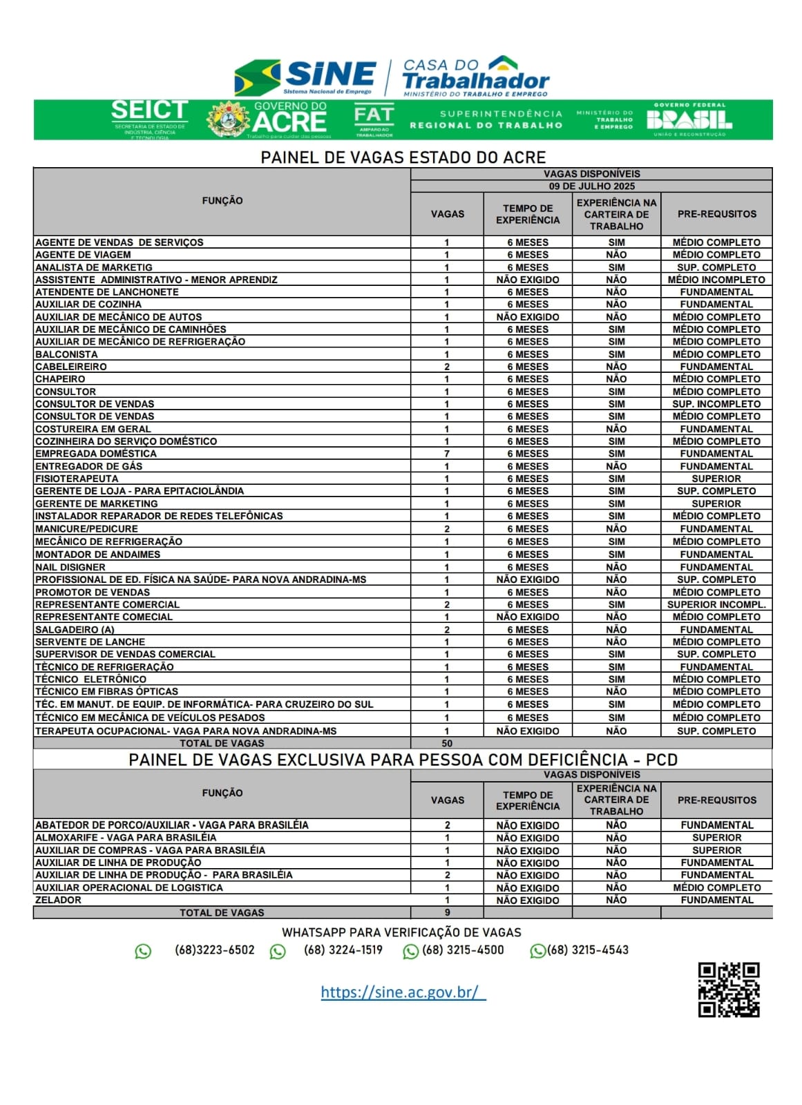 O Sistema Nacional de Emprego do Acre (Sine-AC) oferece 59 vagas de emprego para a população de Rio Branco nesta quarta-feira (9). Destas vagas, nove são destinadas exclusivamente às pessoas com deficiência.