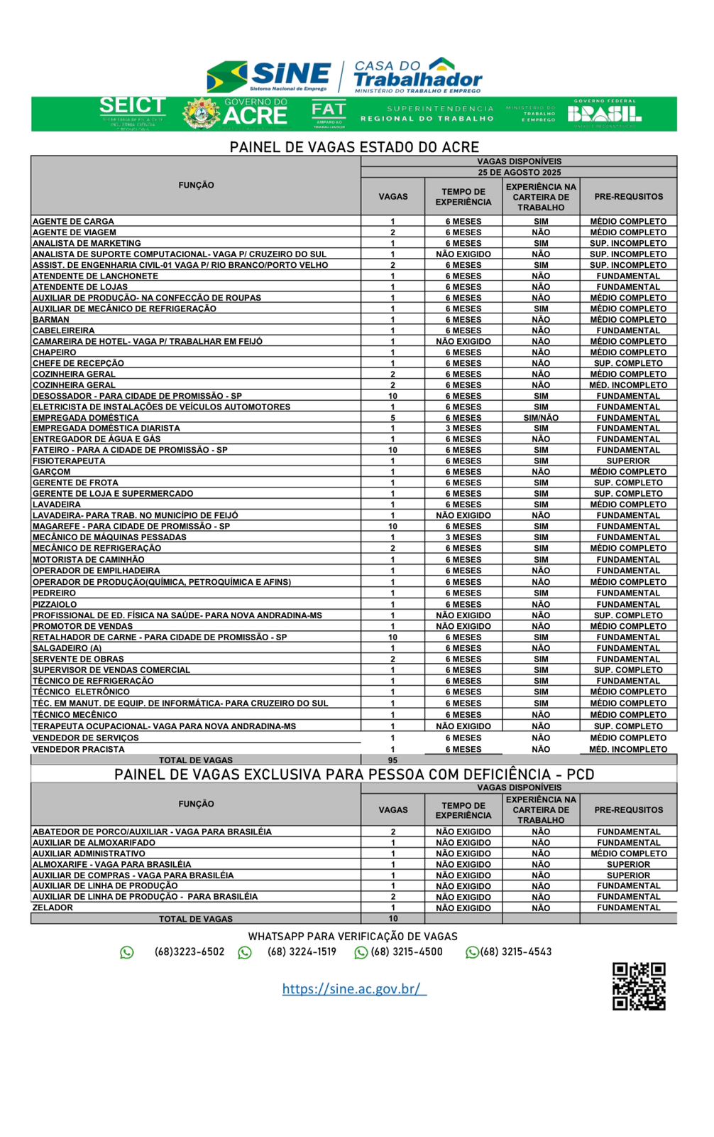 O Sistema Nacional de Emprego do Acre (Sine-AC) oferece 95 vagas de emprego para a população de Rio Branco nesta quarta-feira (9). Destas vagas, dez são destinadas exclusivamente às pessoas com deficiência.