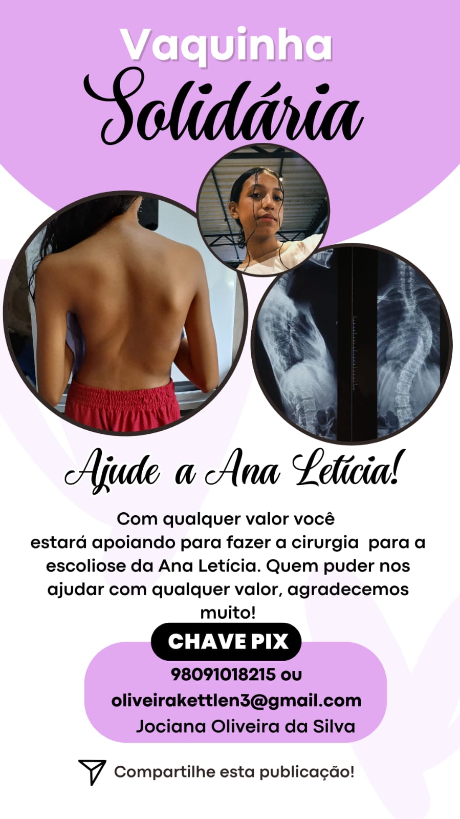 Pais de Ana Letícia, de 14 anos, criaram uma vaquinha online para custear a cirurgia da filha, diagnosticada com escoliose, doença caracterizada pela curvatura anormal da coluna vertebral. Sem recursos financeiros e diante das dificuldades no acesso ao tratamento pelo sistema público de saúde, a família busca ajuda para arcar com a cirurgia.