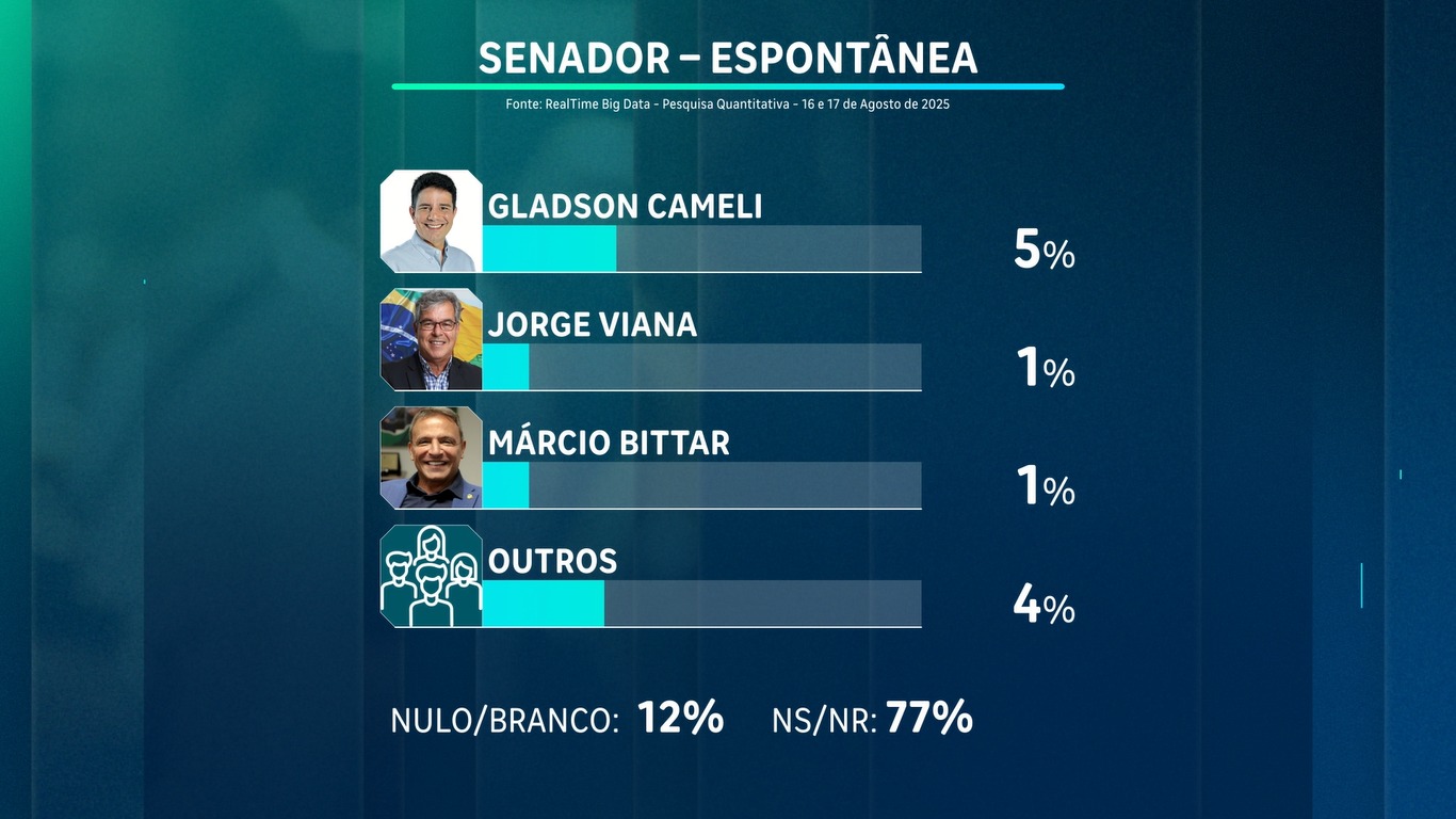 Pela primeira vez neste ano, a TV Gazeta divulgou na manhã desta terça-feira, 19, por meio do programa Gazeta Alerta, o resultado da pesquisa de intenções de votos para o Governo do Acre e também para o Senado nas eleições de 2026. Os dados foram coletados pela Realtime Big Data nos dias 16 a 17 de agosto.