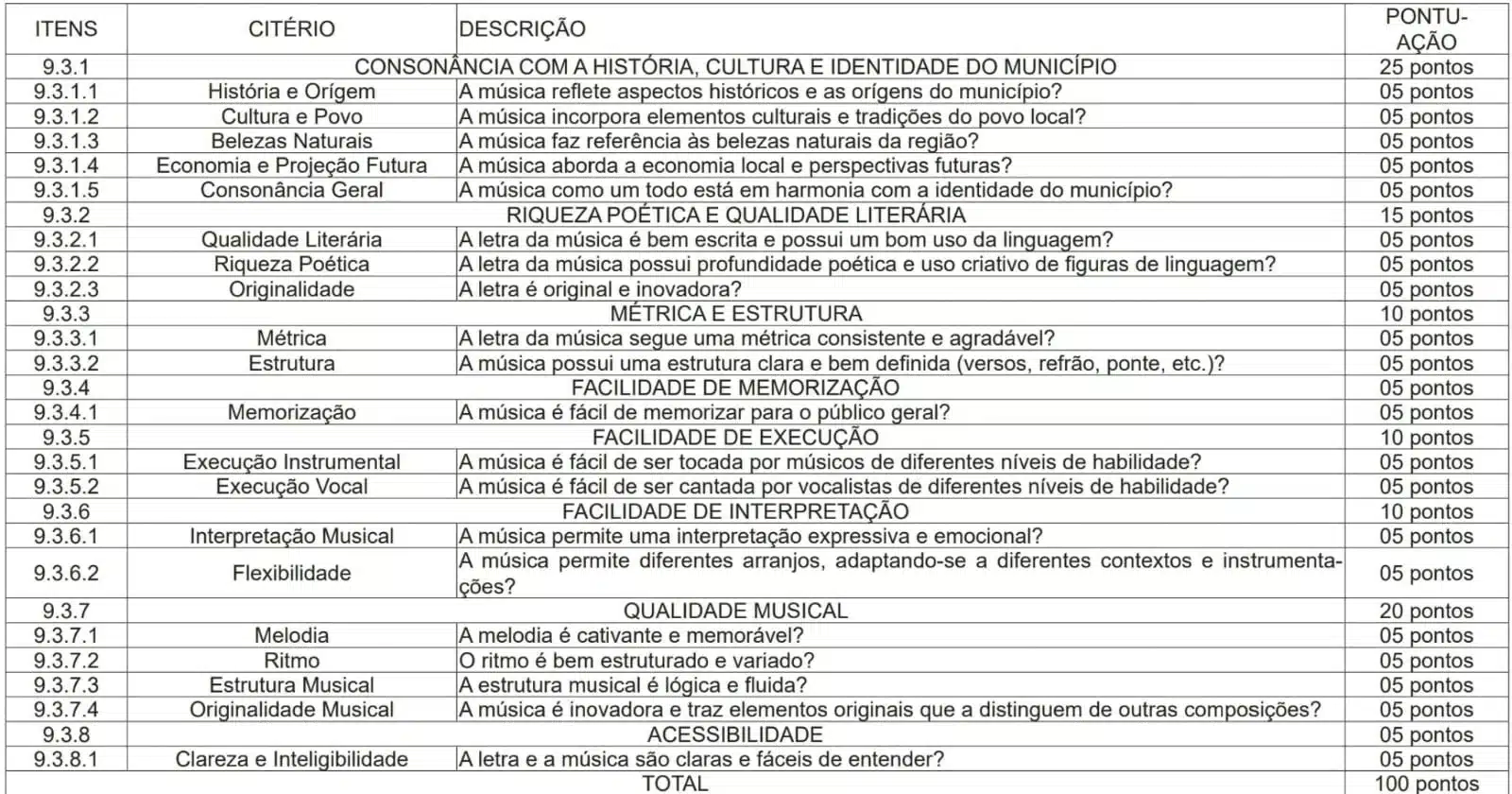Os critérios para o hino ganhador na avaliação pela Comissão são os seguintes: