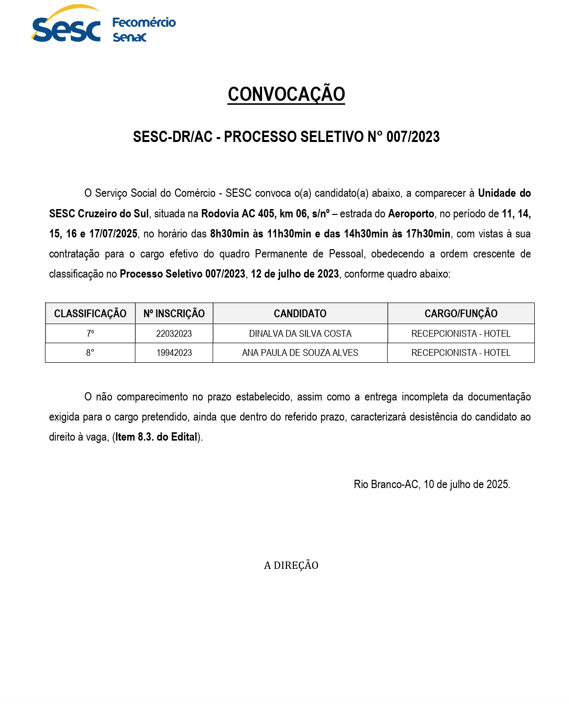 Processo Seletivo Convocação n° 007/2023 Sesc-DR/AC