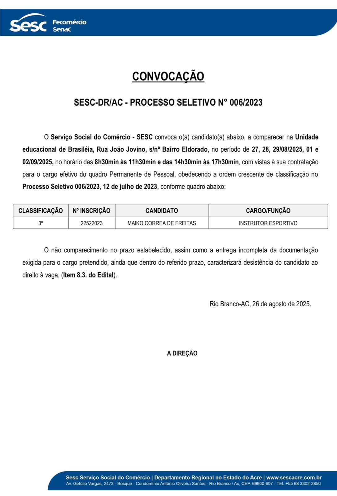 Processo Seletivo Convocação Sesc- DR/AC n° 006/2023