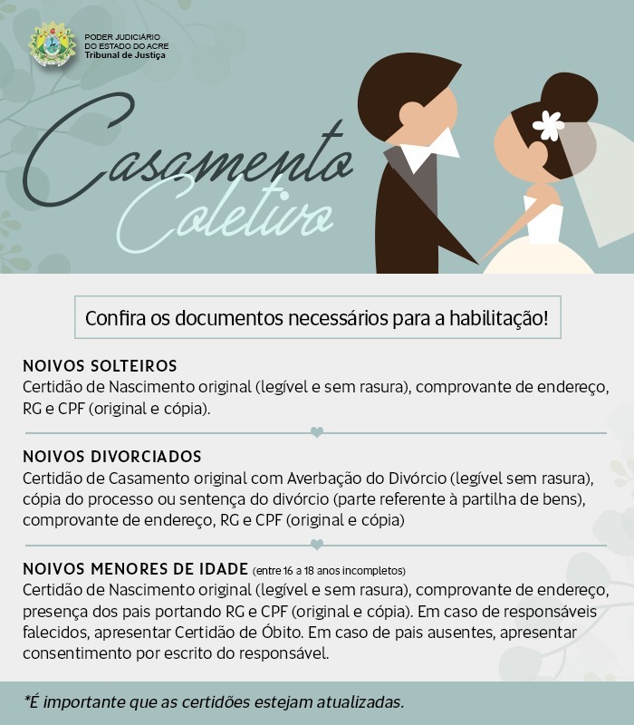 O Tribunal de Justiça do Estado do Acre (TJAC), através do Projeto Cidadão, realizará nos dias 2 e 6 de agosto mais duas edições do Casamento Coletivo. Dia 2 será na Escola Jader Saraiva Machado, na Vila do V, em Porto Acre, e dia 6, na Praça São Gabriel, em Xapuri.