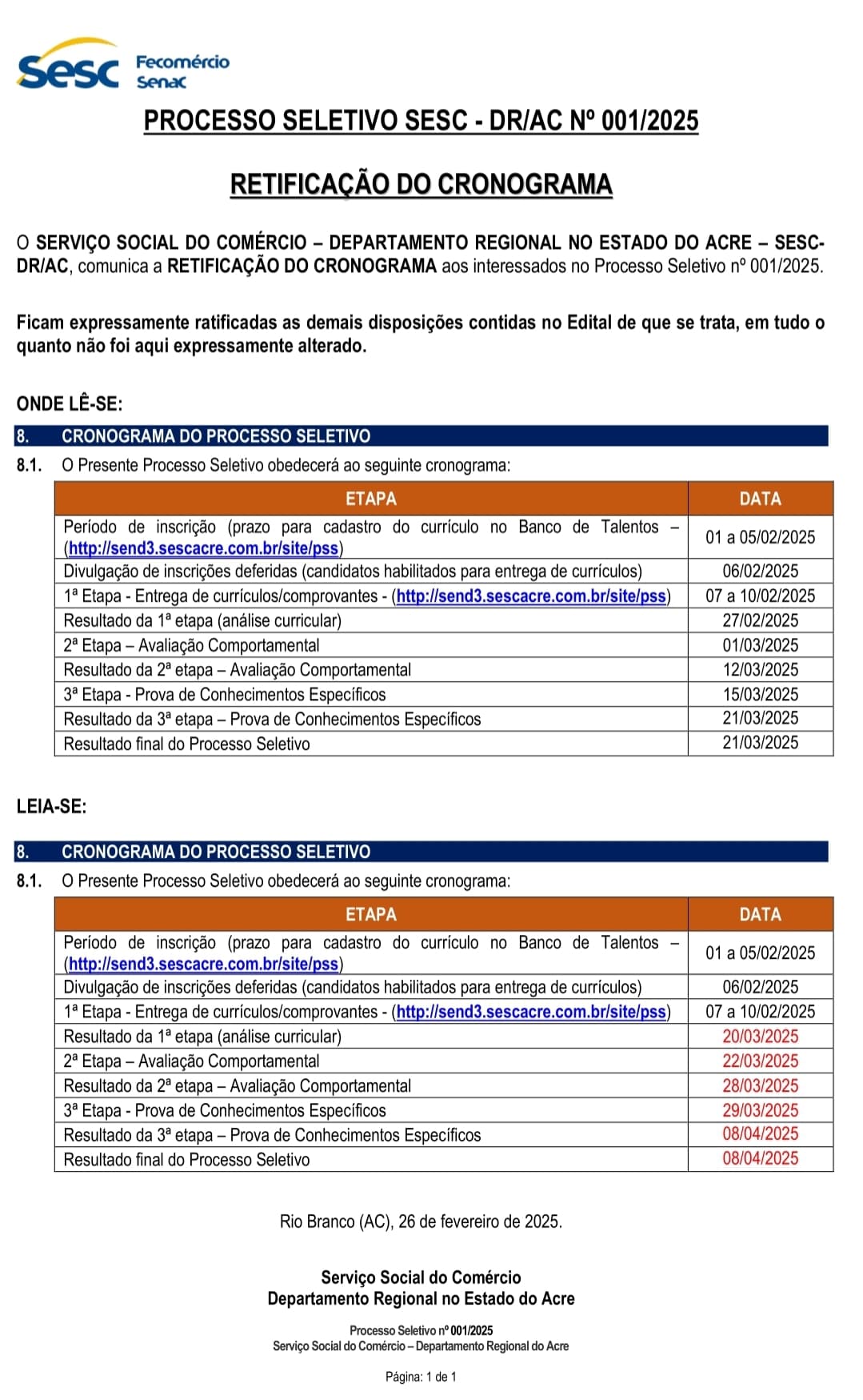 Retificação do Cronograma Processo Seletivo Simplificado Sesc-DR/AC n° 001/2025