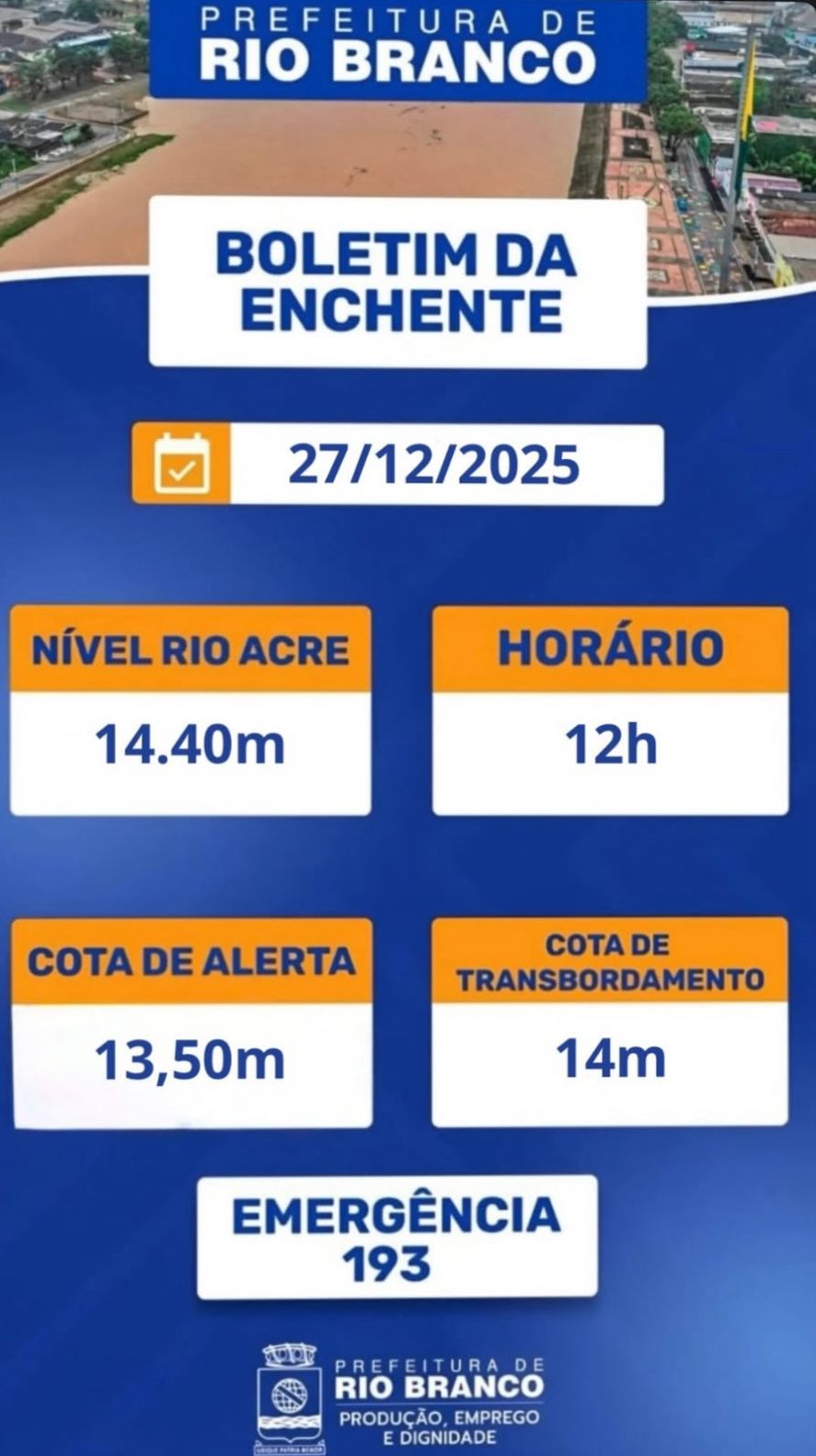 Às 5h26, o Rio Acre marcava 13,73 metros, subindo para 14 metros às 9h, quando atingiu oficialmente a cota de transbordamento. Em poucas horas, o nível continuou em elevação, ampliando o risco de alagamentos.