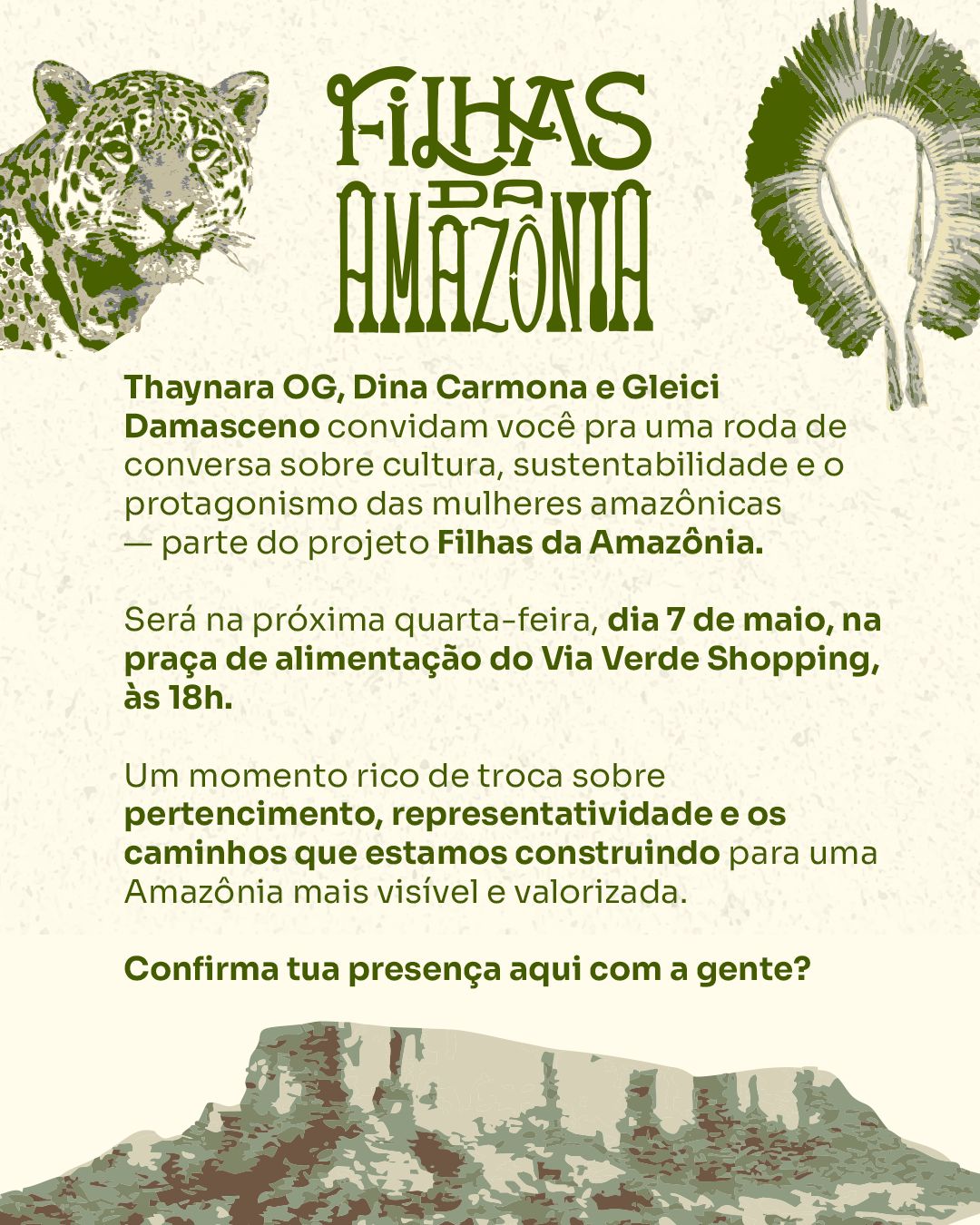 Acontece nesta quarta-feira, 7 de maio, às 18h, na praça de alimentação do Via Verde Shopping, uma roda de conversa com três mulheres que têm usado suas vozes para falar da Amazônia de diferentes formas: Thaynara OG, Dina Carmona e Gleici Damasceno.