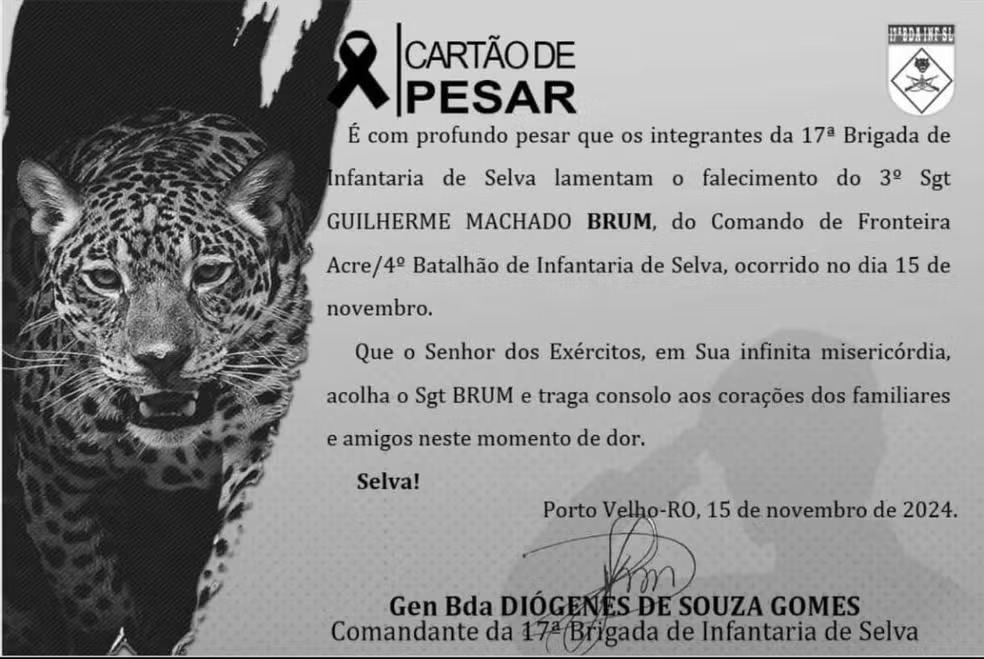 Além dessas informações, a 17° Brigada de Infantaria de Selva e o 4° Batalhão de Infantaria de Selva, lamentaram a morte do militar Guilherme Machado Brum, que estava no Acre há 11 meses e era natural era natural da cidade de Cacequi – Rio Grande do Sul.