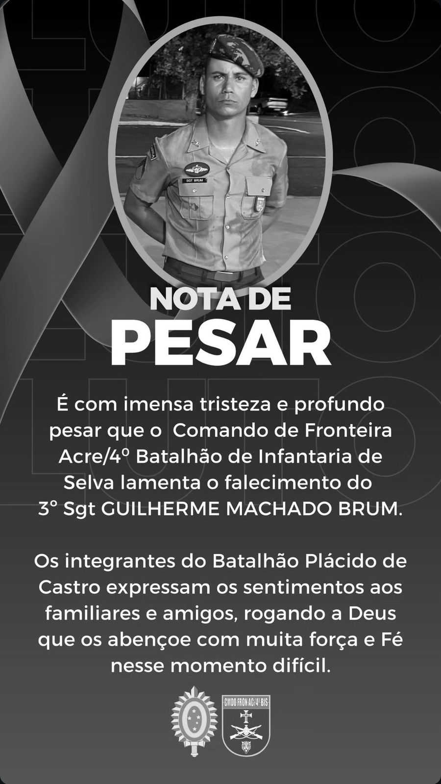 “Que o Senhor dos Exércitos, em Sua infinita misericórdia, acolha o Sgt BRUM e traga consolo aos corações dos familiares e amigos neste momento de dor. Selva!”, diz nota de pesar.