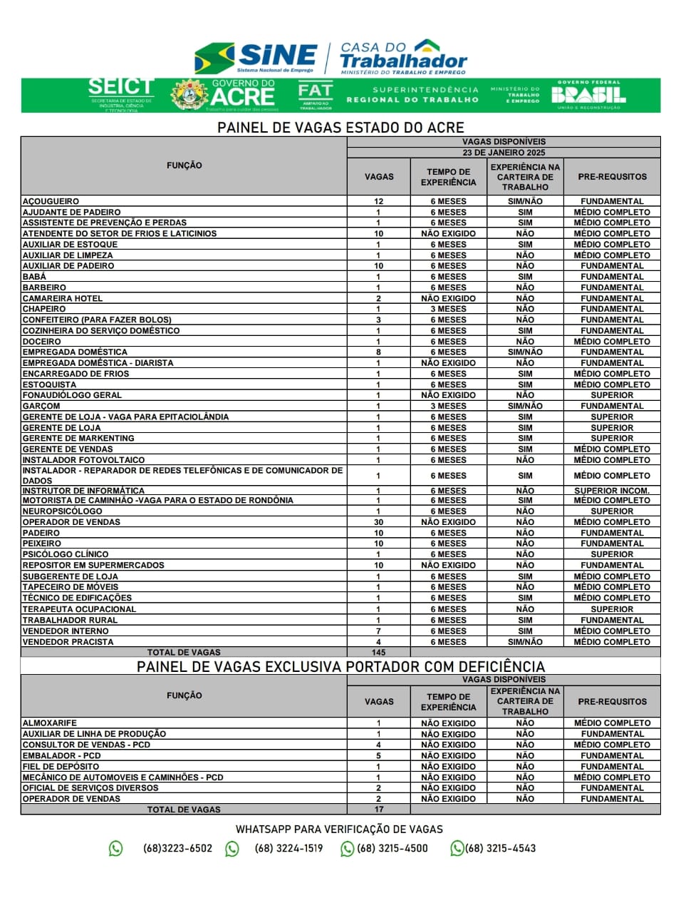 O Sistema Nacional de Emprego do Acre (Sine) oferece 145 vagas de emprego para a população de Rio Branco nesta quinta-feira (23). Destas vagas, 17 são destinadas exclusivamente às pessoas portadoras de deficiência.